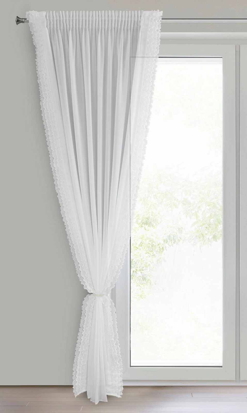 Firana gotowa zdobiona aplikacją z dekoracyjnym troczkiem szerokość: 140 cm, długość: 270 cm, kolor: biały, Gramatura: 60 GSM, Skład: 100% poliester