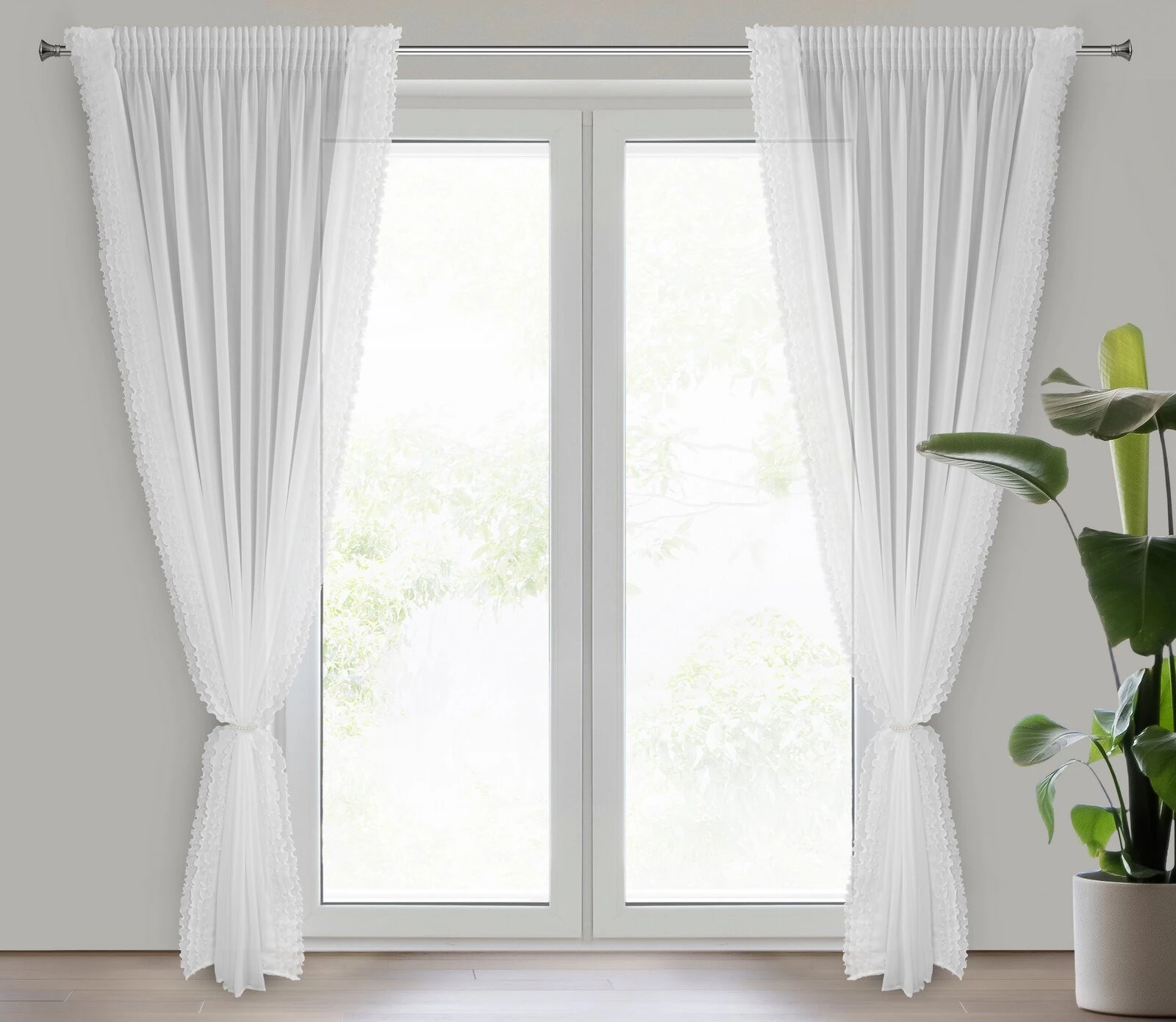 - Firana gotowa zdobiona aplikacją z dekoracyjnym troczkiem szerokość: 140 cm, długość: 270 cm, kolor: biały, Gramatura: 60 GSM, Skład: 100% poliester