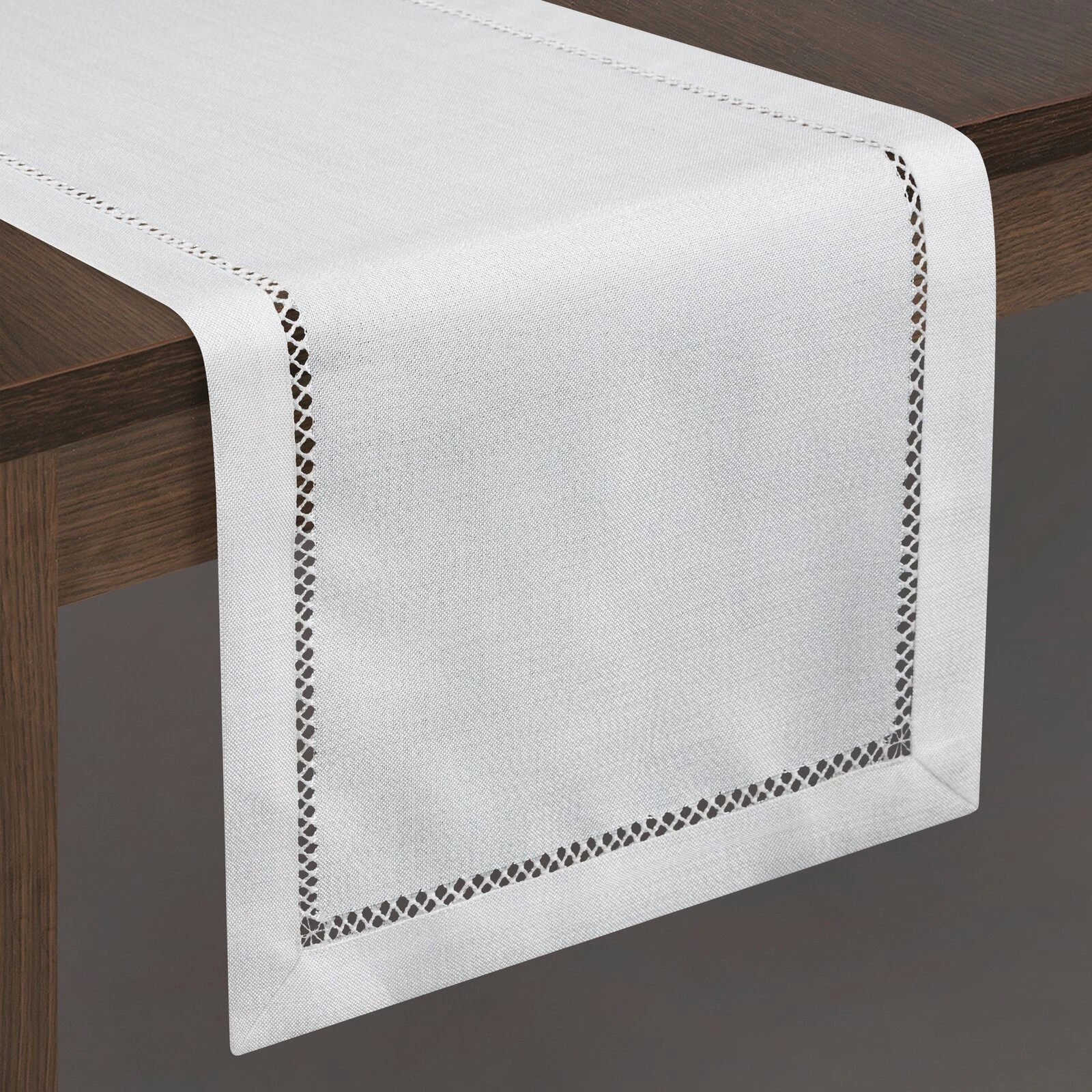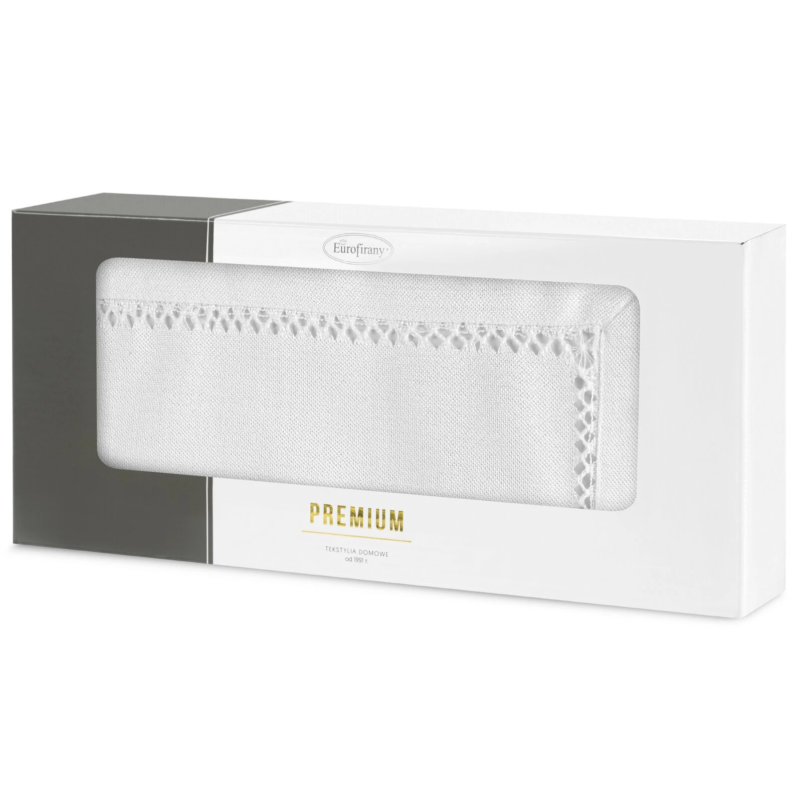 Bieżnik z mereżką, zapakowany w eleganckie pudełko szerokość: 40 cm, długość: 200 cm, kolor: biały, Gramatura: 245 GSM, Skład: 100% poliester