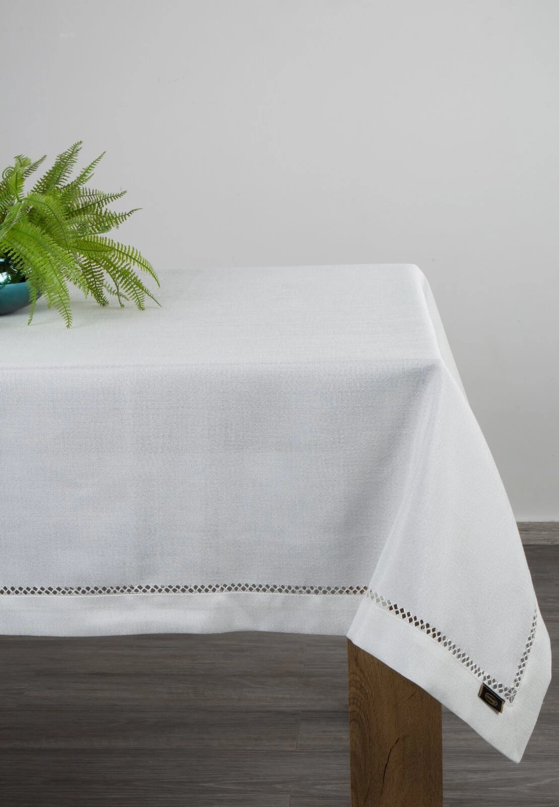 - Obrus z mereżką, zapakowany w eleganckie pudełko szerokość: 140 cm, długość: 180 cm, kolor: biały, Gramatura: 245 GSM, Skład: 100% poliester