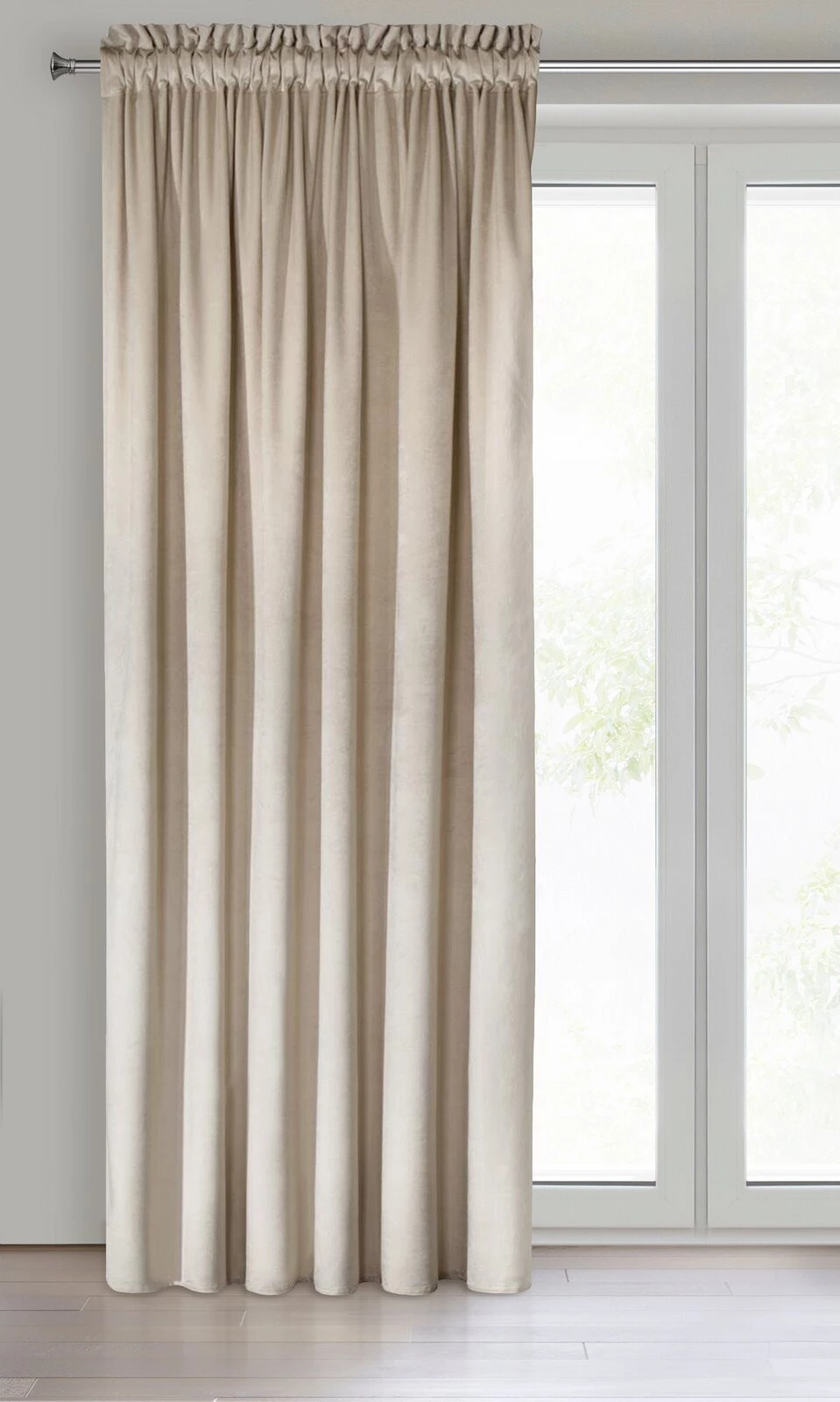 Miękka zasłona z welwetu o matowym wykończeniu. Mięsista tkanina o średnich właściwościach zaciemniających nadaje wnętrzu eleganckiego charakteru. szerokość: 140 cm, długość: 270 cm, kolor: beżowy, Gramatura: 200 GSM, Skład: 100% poliester