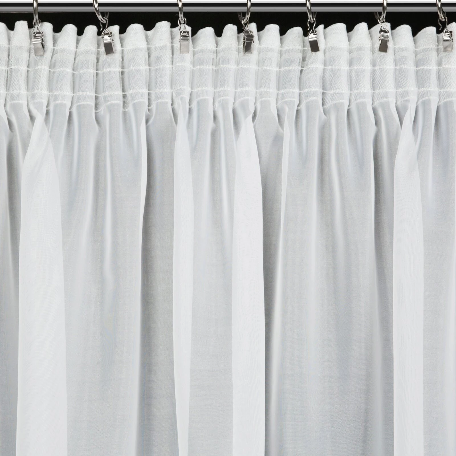 Klasyczna, długa, krótka firana uszyta z gładkiego, miękkiego woalu. Subtelna tkanina łatwo się pracuje a po upięciu układa się w miekkie fale. szerokość: 300 cm, długość: 160 cm, kolor: biały, Gramatura: 50 GSM, Skład: 100% poliester