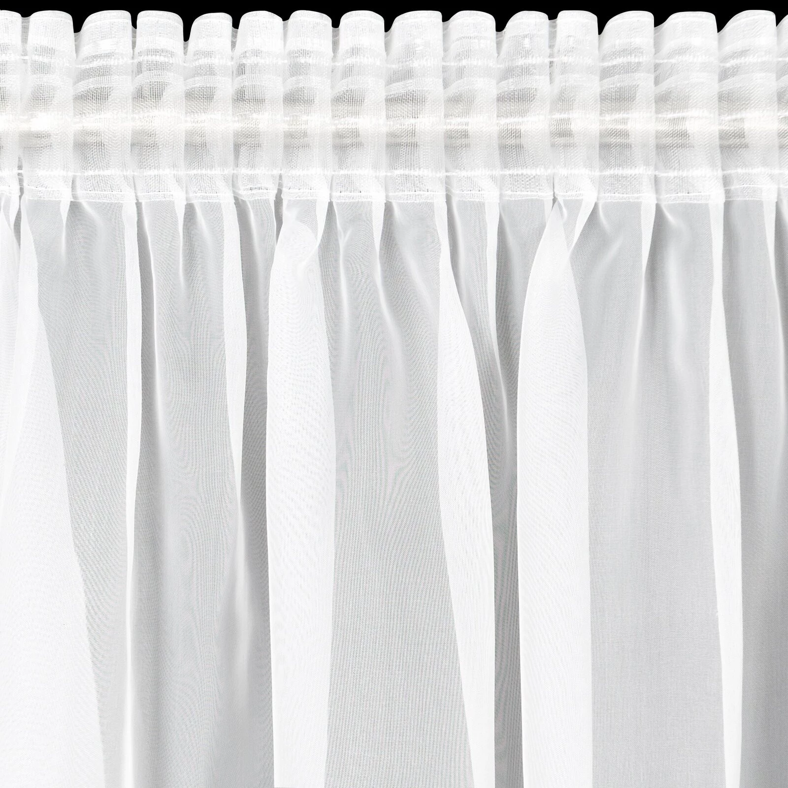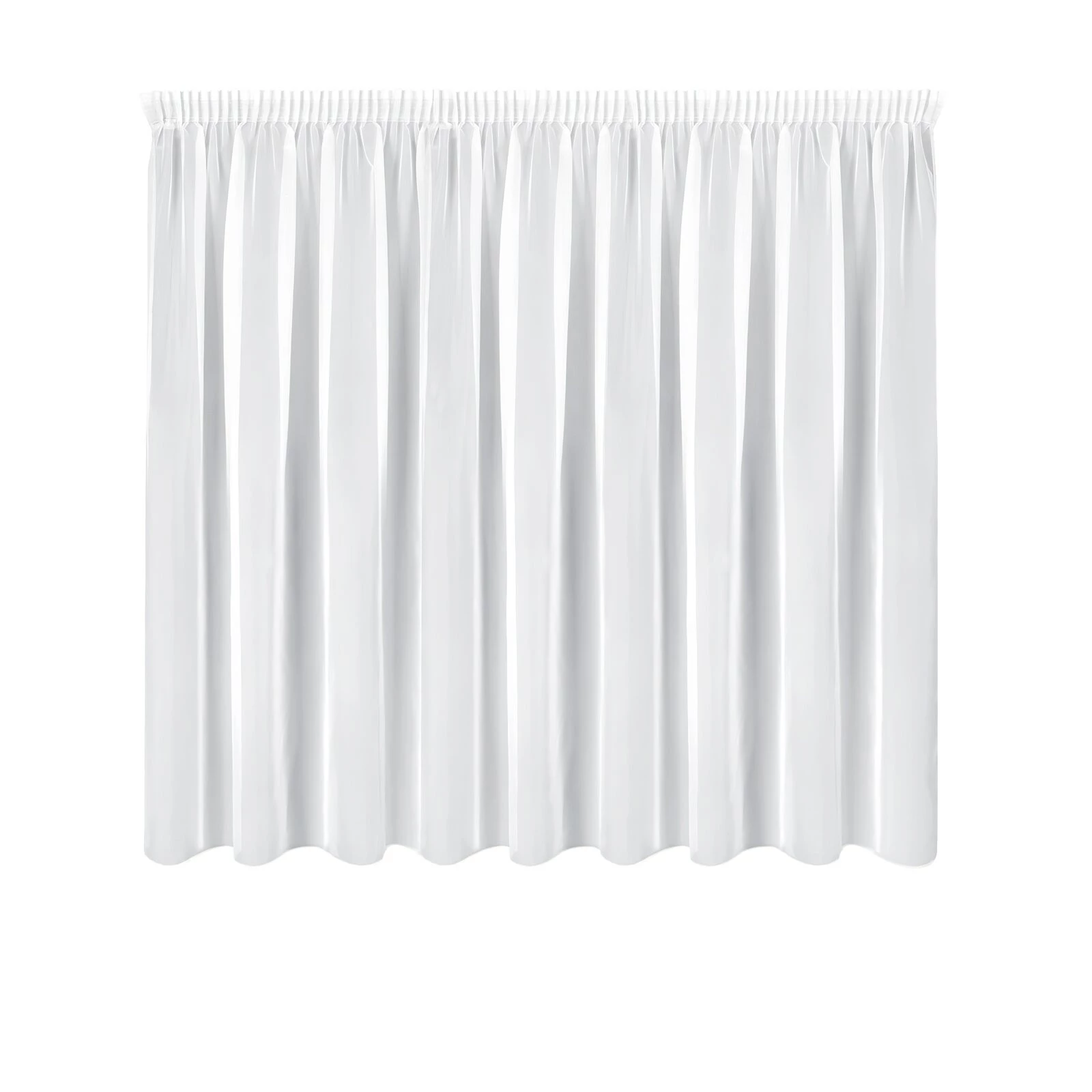Klasyczna, długa, krótka firana uszyta z gładkiego, miękkiego woalu. Subtelna tkanina łatwo się pracuje a po upięciu układa się w miekkie fale. szerokość: 350 cm, długość: 150 cm, kolor: biały, Gramatura: 50 GSM, Skład: 100% poliester