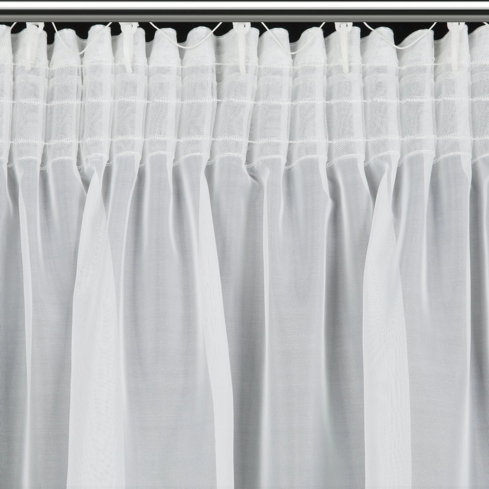 - Klasyczna, długa, krótka firana uszyta z gładkiego, miękkiego woalu. Subtelna tkanina łatwo się pracuje a po upięciu układa się w miekkie fale. szerokość: 350 cm, długość: 150 cm, kolor: biały, Gramatura: 50 GSM, Skład: 100% poliester