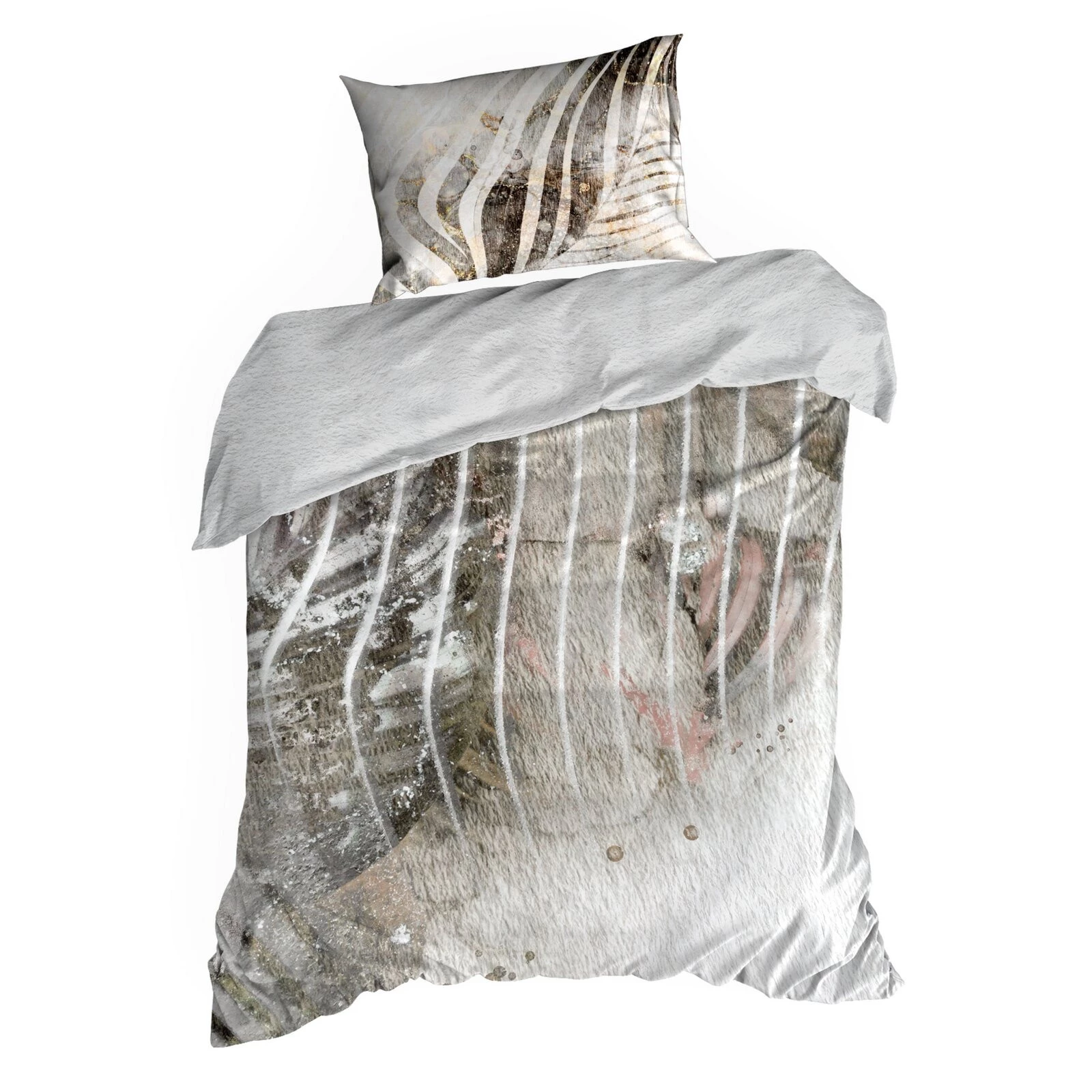 Komplet ekskluzywnej, designerskiej pościeli z satyny bawełnianej z kolekcji polecanej przez Eva Minge. Zapinana na zamek błyskawiczny. Precyzyjne wykonanie. szerokość: 220 cm, długość: 200 cm, kolor: szarobeżowy, Gramatura: 125 GSM, Skład: makosatyna, 100% bawełna