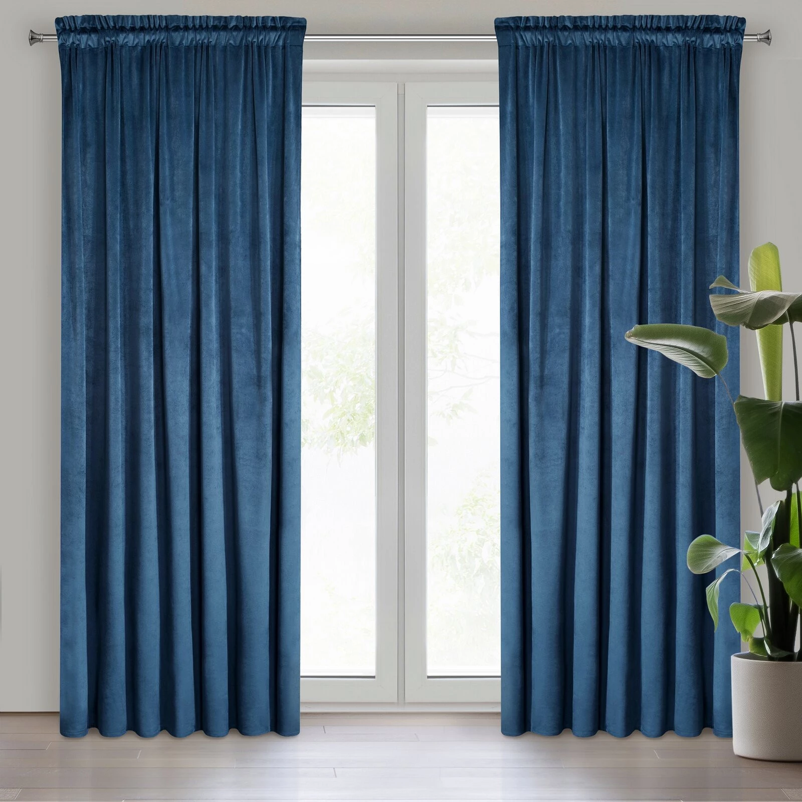 Miękka zasłona z welwetu o matowym wykończeniu. Mięsista tkanina o średnich właściwościach zaciemniających nadaje wnętrzu eleganckiego charakteru. szerokość: 140 cm, długość: 270 cm, kolor: granatowy, Gramatura: 200 GSM, Skład: 100% poliester