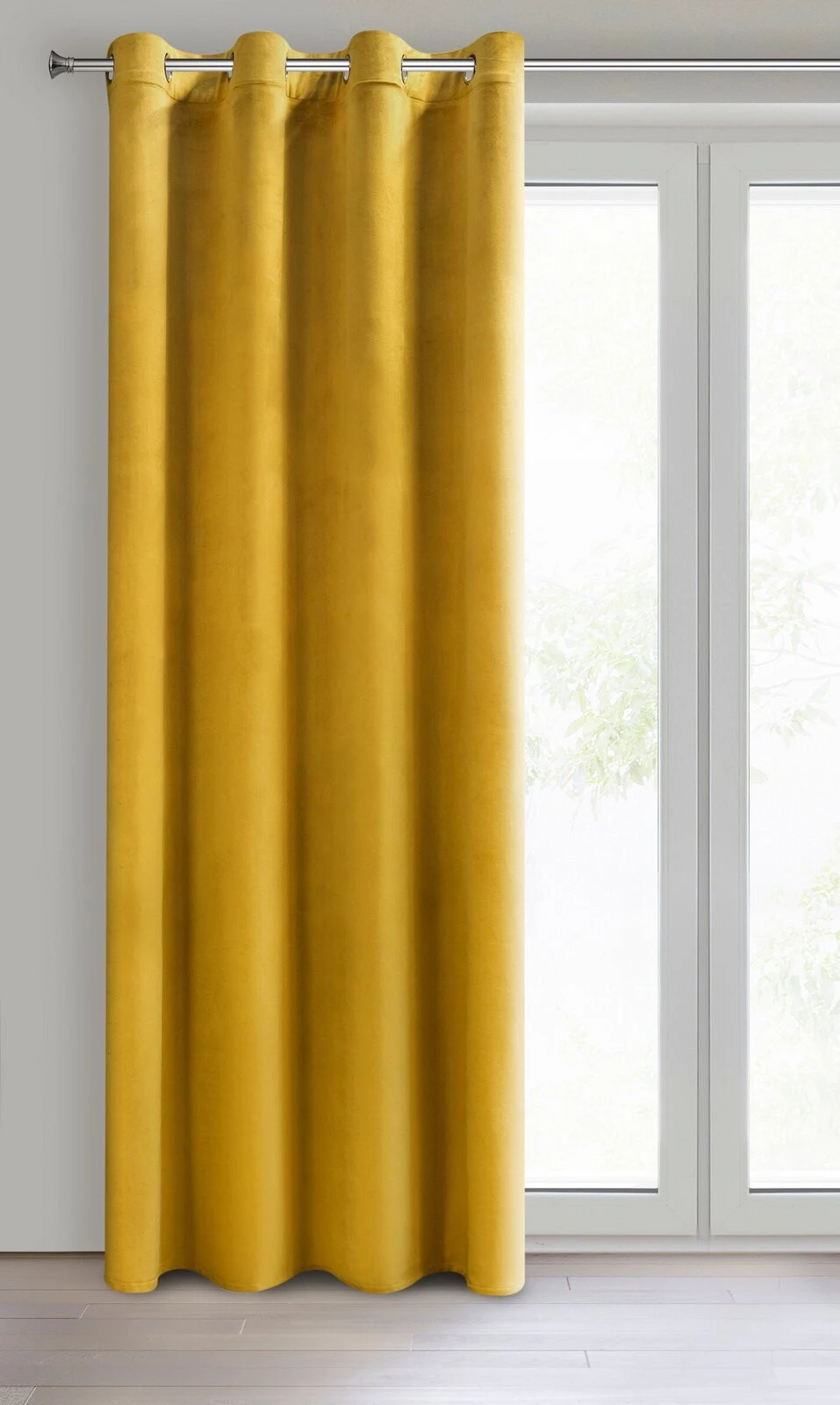 - Zasłona welwetowa jednokolorowa szerokość: 140 cm, długość: 250 cm, kolor: musztardowy, Gramatura: 200 GSM, Skład: 100% poliester