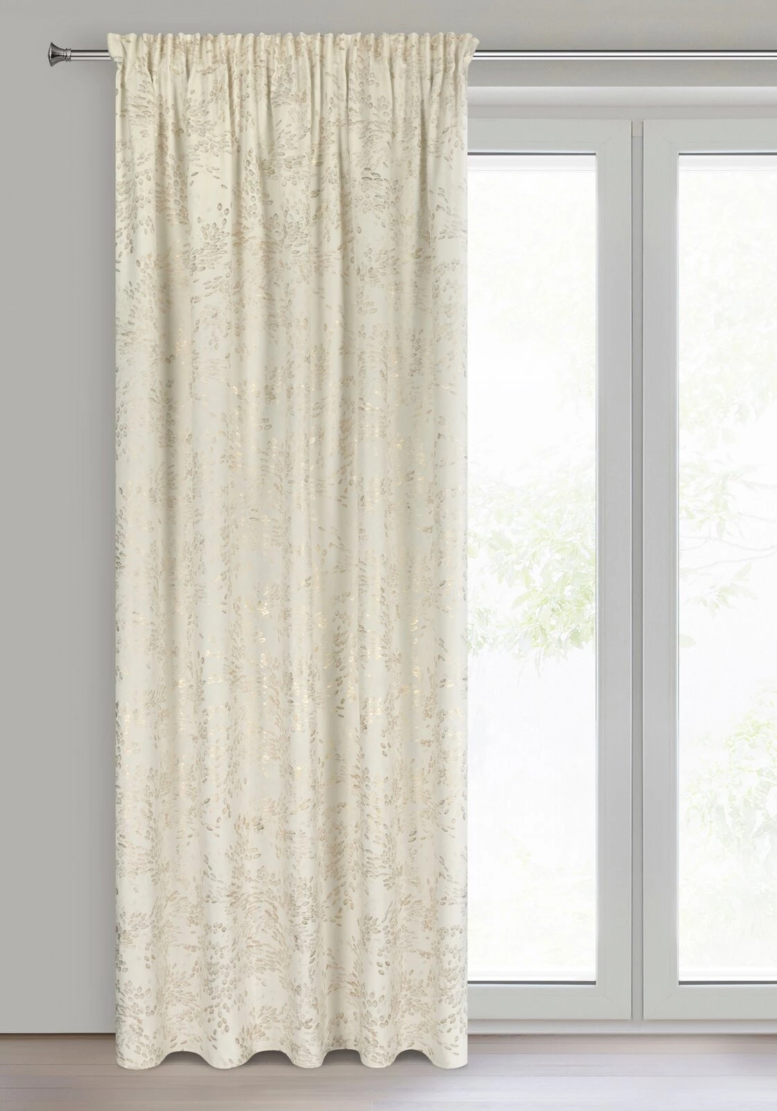 - Zasłona gotowa welwetowa z nadrukiem błyszczącym szerokość: 140 cm, długość: 270 cm, kolor: kremowy, Gramatura: 200 GSM, Skład: 100% poliester