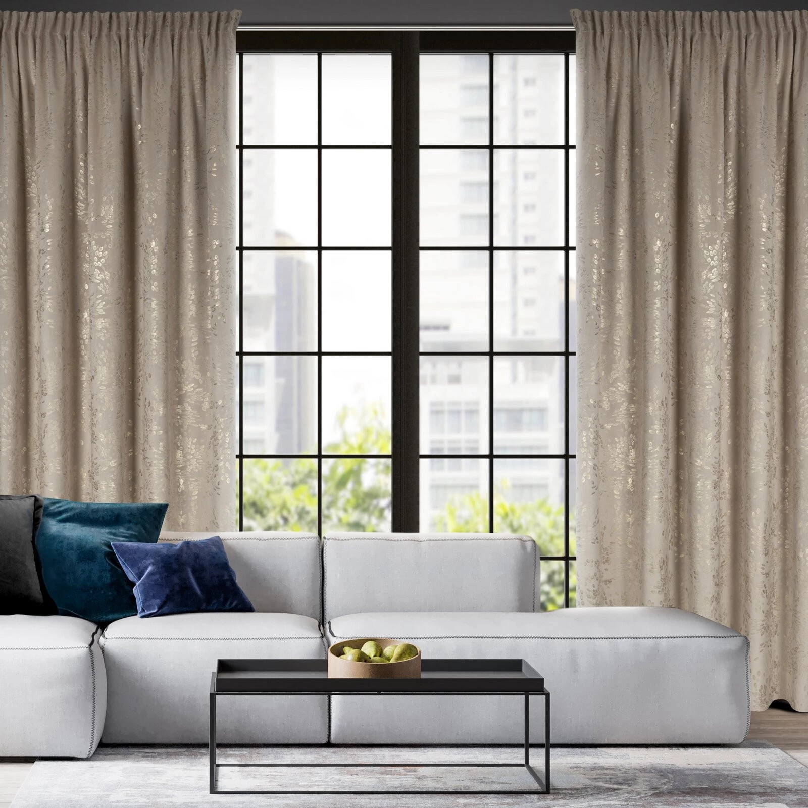 Zasłona gotowa welwetowa z nadrukiem błyszczącym szerokość: 140 cm, długość: 270 cm, kolor: beżowy, Gramatura: 200 GSM, Skład: 100% poliester