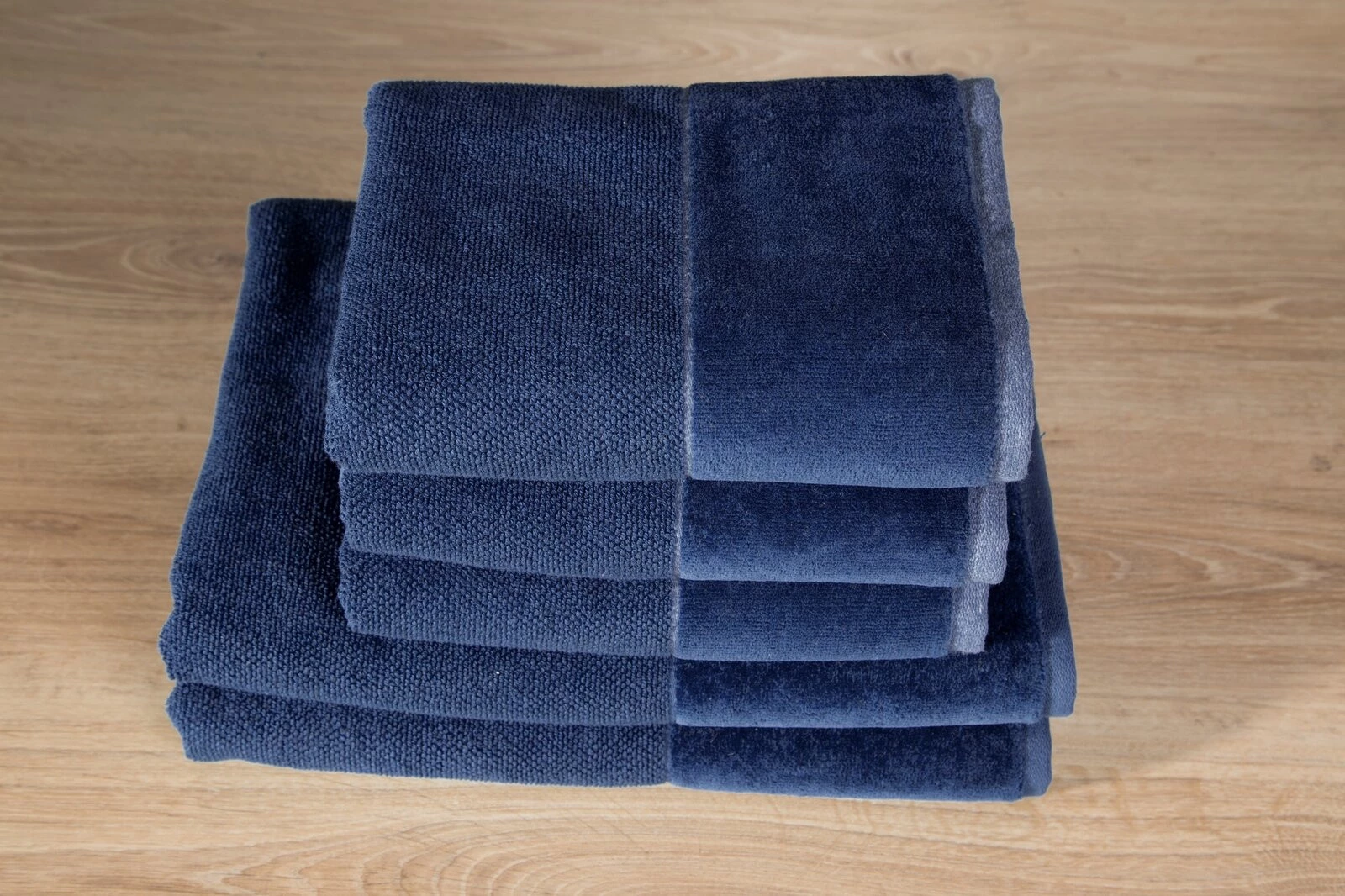 Miękki i bardzo puszysty ręcznik kąpielowy o minimalistycznym charakterze. Szeroka bordiura z welwetu dodaje lekkiego połysku. Chłonna bawełna frote nie farbuje szerokość: 30 cm, długość: 50 cm, kolor: granatowy, Gramatura: 500 GSM, Skład: 100% bawełna