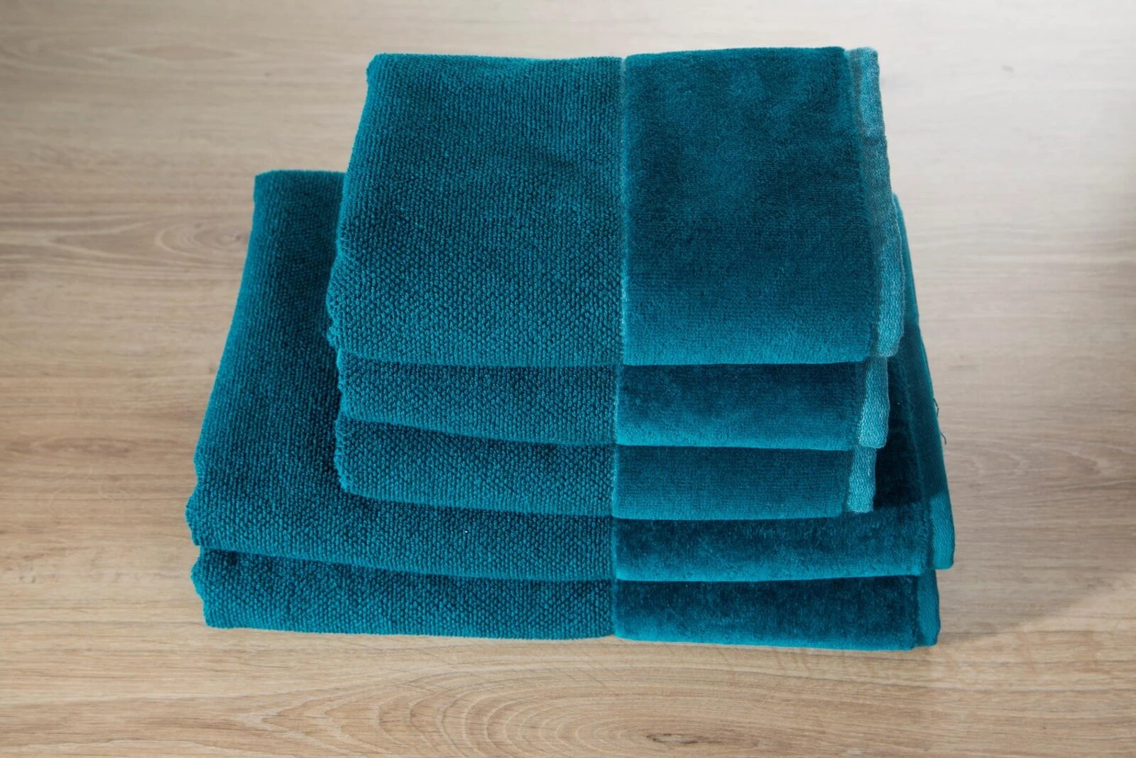 Miękki i bardzo puszysty ręcznik kąpielowy o minimalistycznym charakterze. Szeroka bordiura z welwetu dodaje lekkiego połysku. Chłonna bawełna frote nie farbuje szerokość: 50 cm, długość: 90 cm, kolor: ciemnoturkusowy, Gramatura: 500 GSM, Skład: 100% bawełna