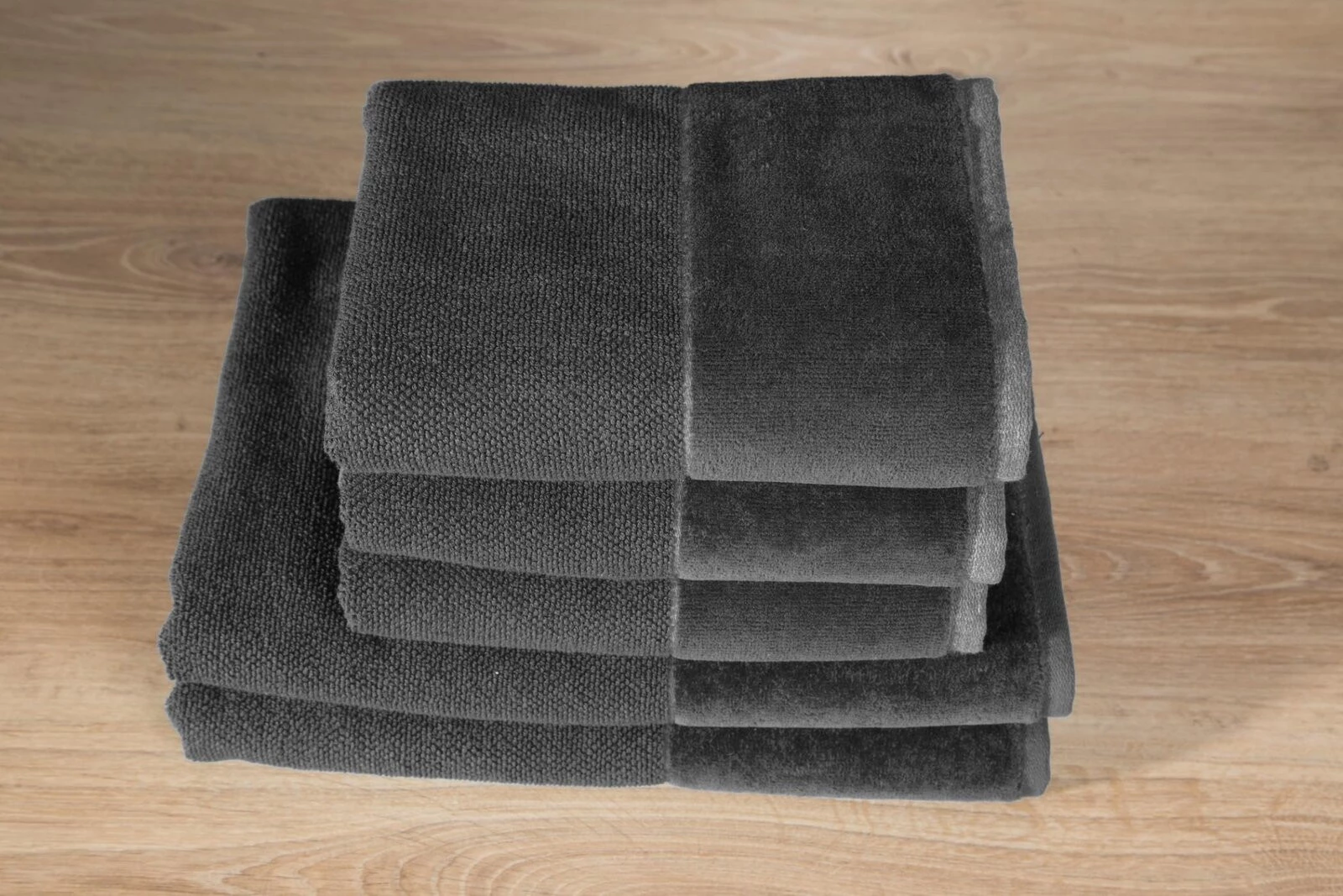Miękki i bardzo puszysty ręcznik kąpielowy o minimalistycznym charakterze. Szeroka bordiura z welwetu dodaje lekkiego połysku. Chłonna bawełna frote nie farbuje szerokość: 50 cm, długość: 90 cm, kolor: grafitowy, Gramatura: 500 GSM, Skład: 100% bawełna