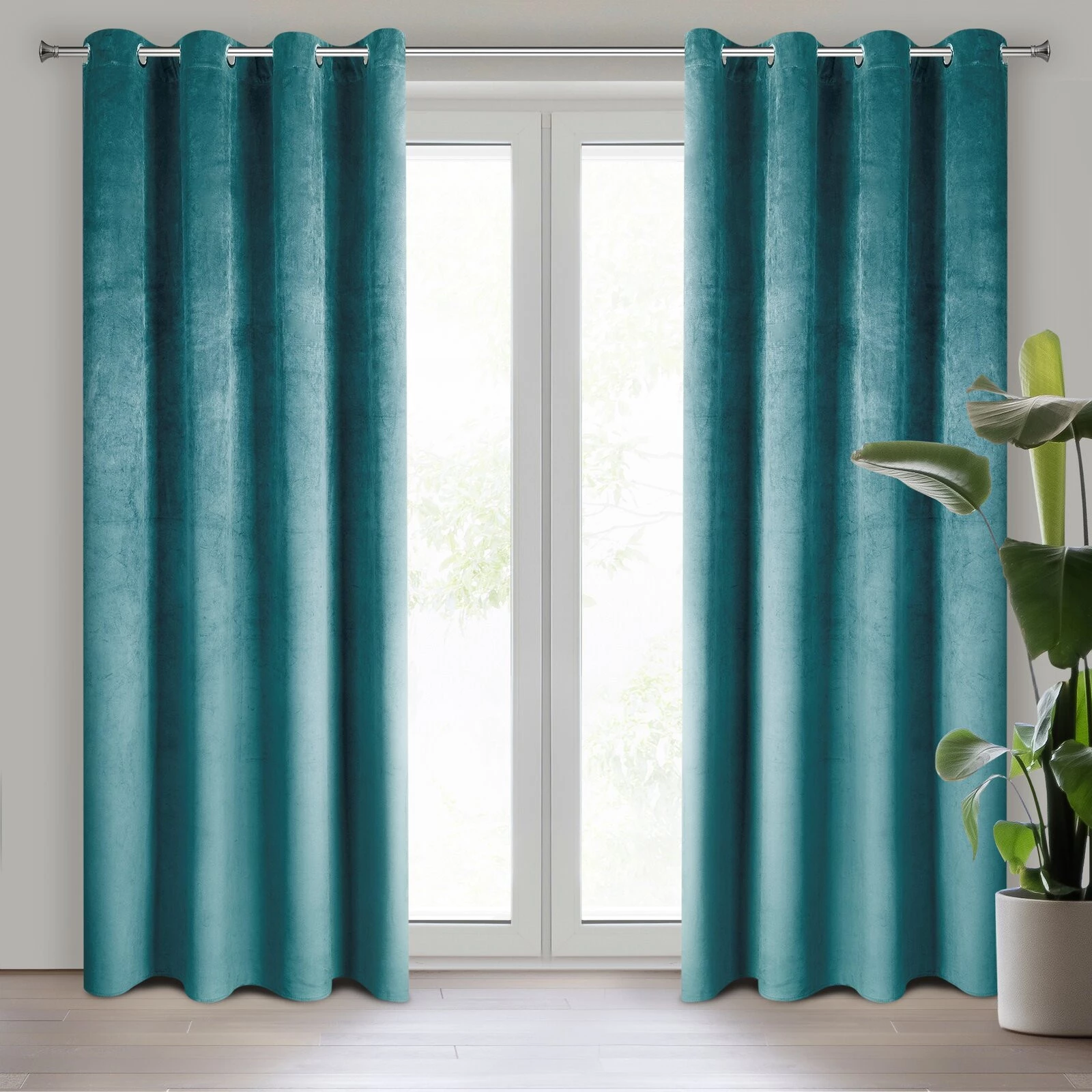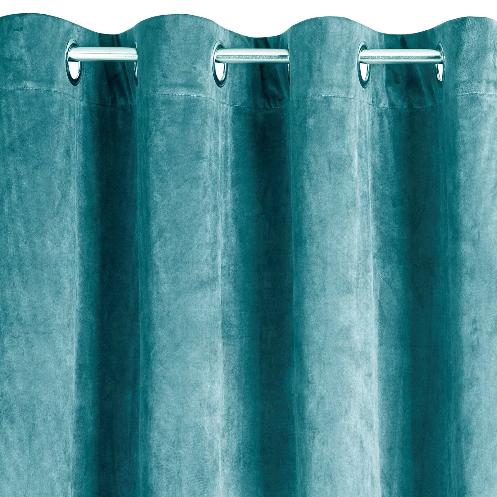 Miękka zasłona gotowa z jednokolorowego aksamitu o charakterystycznym dla welwetu połysku. Mięsista tkanina daje wysoki stopień zaciemnienia wnętrza. szerokość: 140 cm, długość: 250 cm, kolor: turkusowy, Gramatura: 215 GSM, Skład: 100% poliester