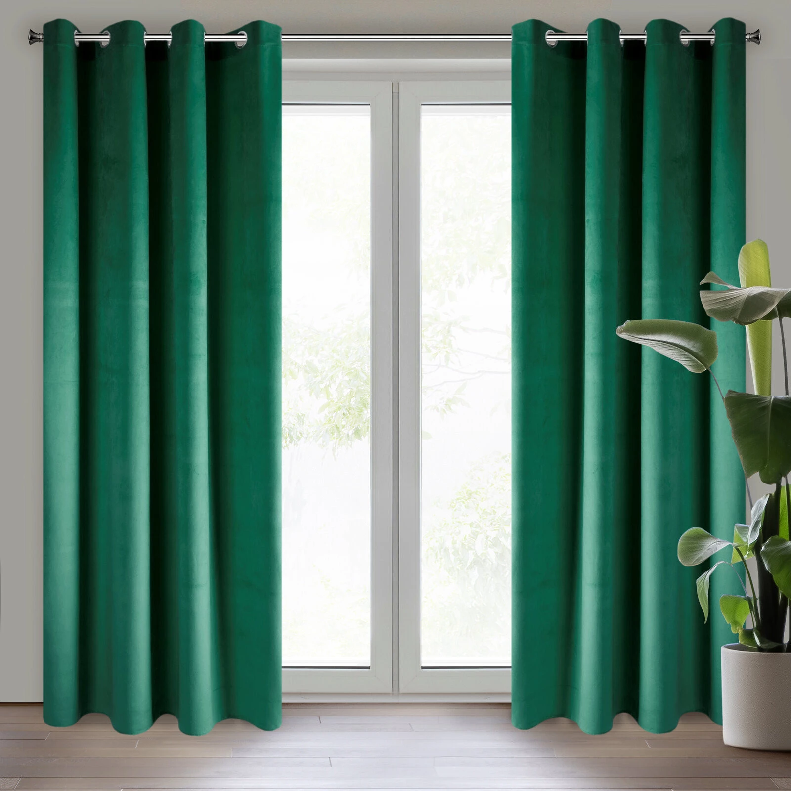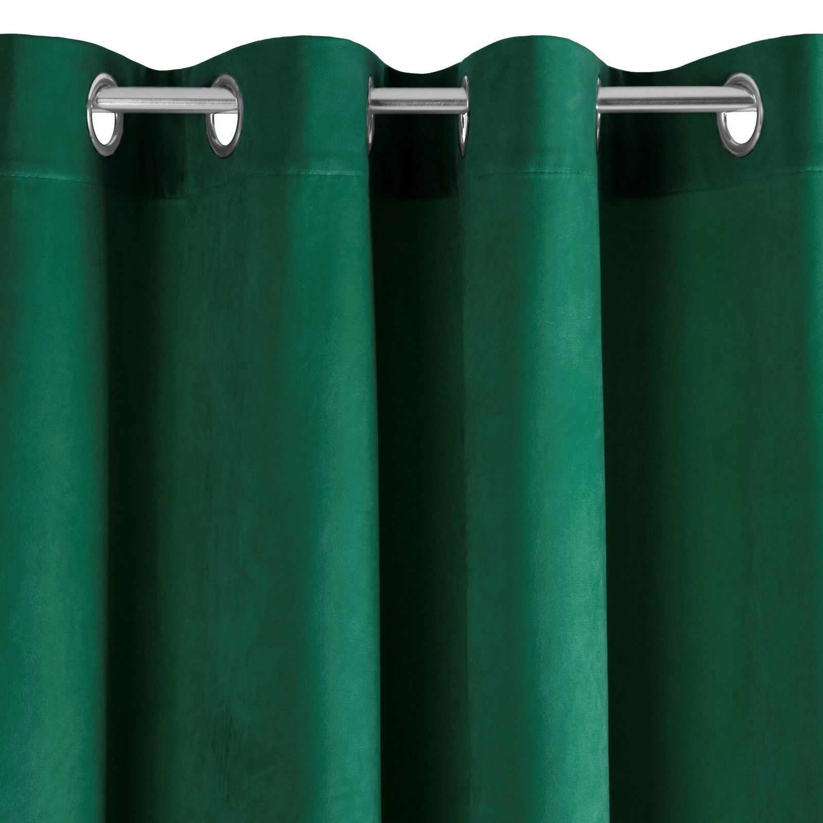 Miękka zasłona gotowa z jednokolorowego aksamitu o charakterystycznym dla welwetu połysku. Mięsista tkanina daje wysoki stopień zaciemnienia wnętrza. szerokość: 140 cm, długość: 250 cm, kolor: ciemnozielony, Gramatura: 215 GSM, Skład: 100% poliester