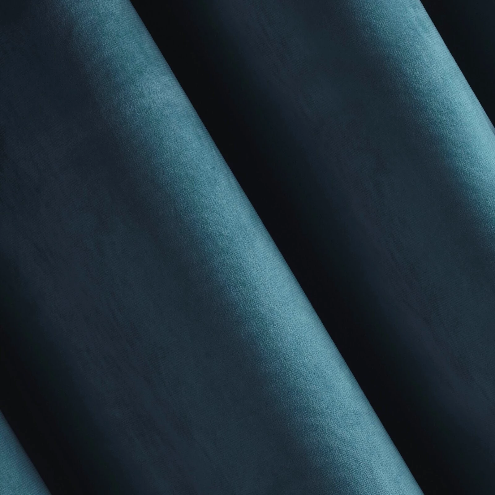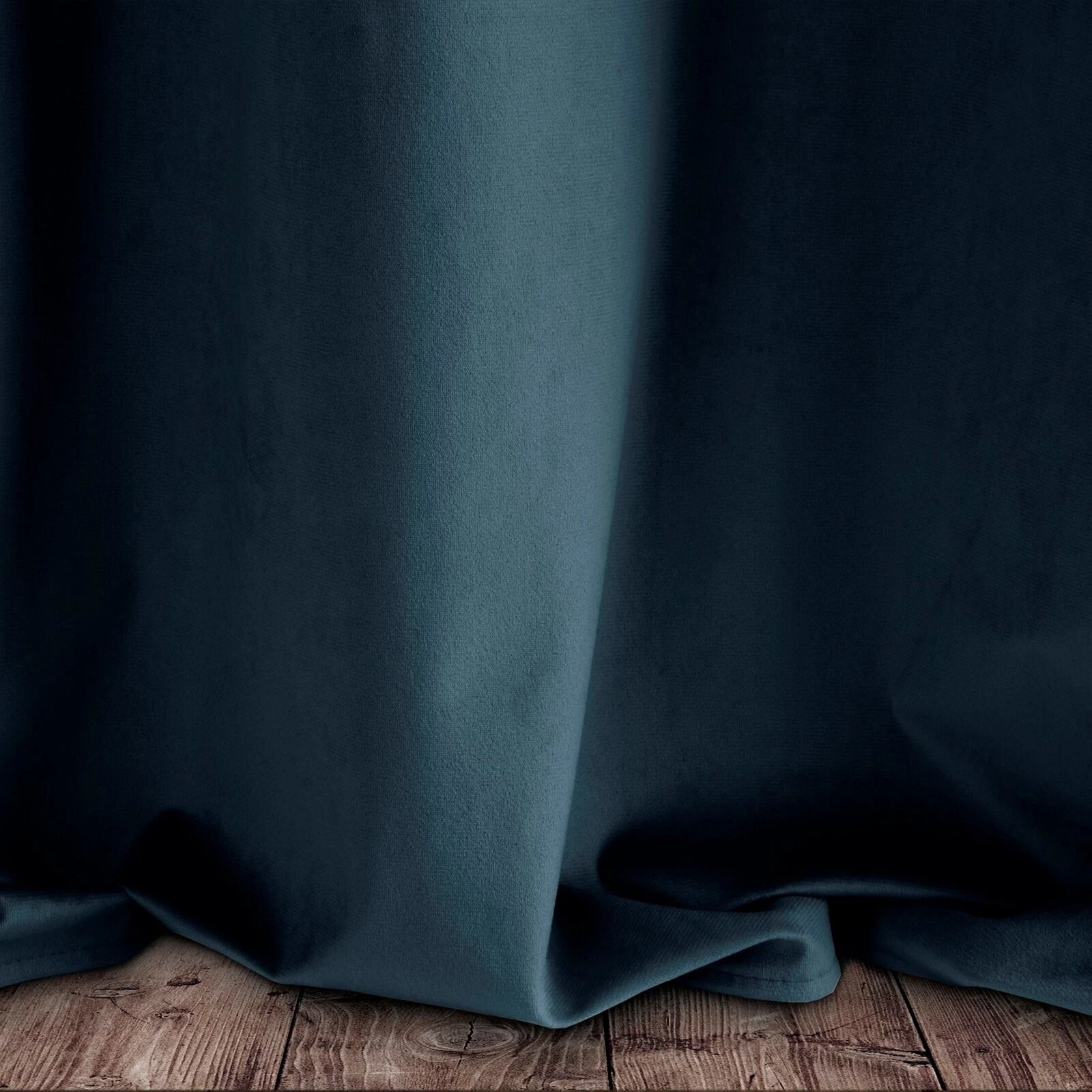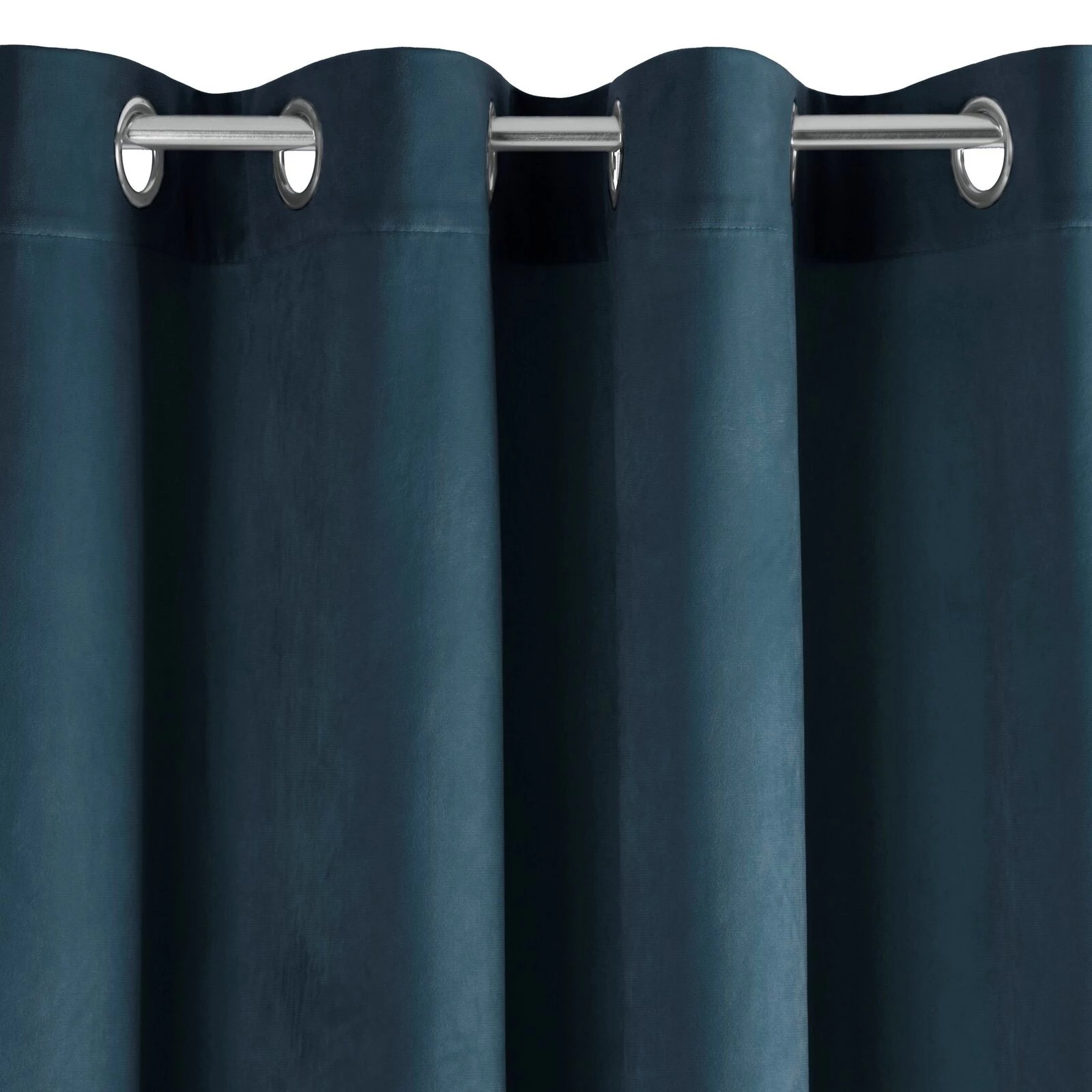 Miękka zasłona gotowa z jednokolorowego aksamitu o charakterystycznym dla welwetu połysku. Mięsista tkanina daje wysoki stopień zaciemnienia wnętrza. szerokość: 140 cm, długość: 250 cm, kolor: granatowy, Gramatura: 215 GSM, Skład: 100% poliester