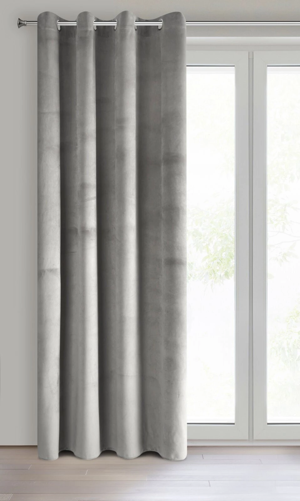 Miękka zasłona gotowa z jednokolorowego aksamitu o charakterystycznym dla welwetu połysku. Mięsista tkanina daje wysoki stopień zaciemnienia wnętrza. szerokość: 140 cm, długość: 250 cm, kolor: szary, Gramatura: 215 GSM, Skład: 100% poliester