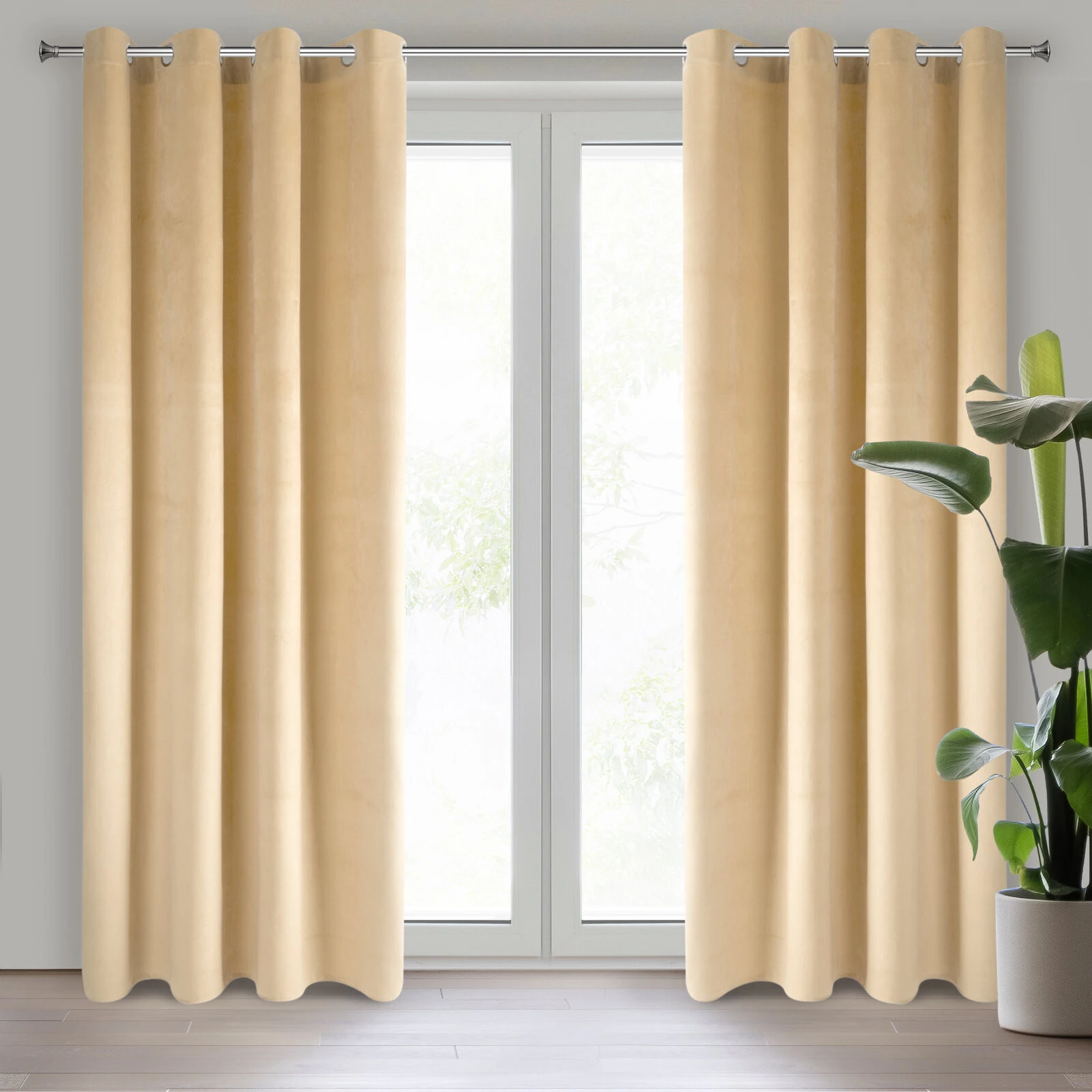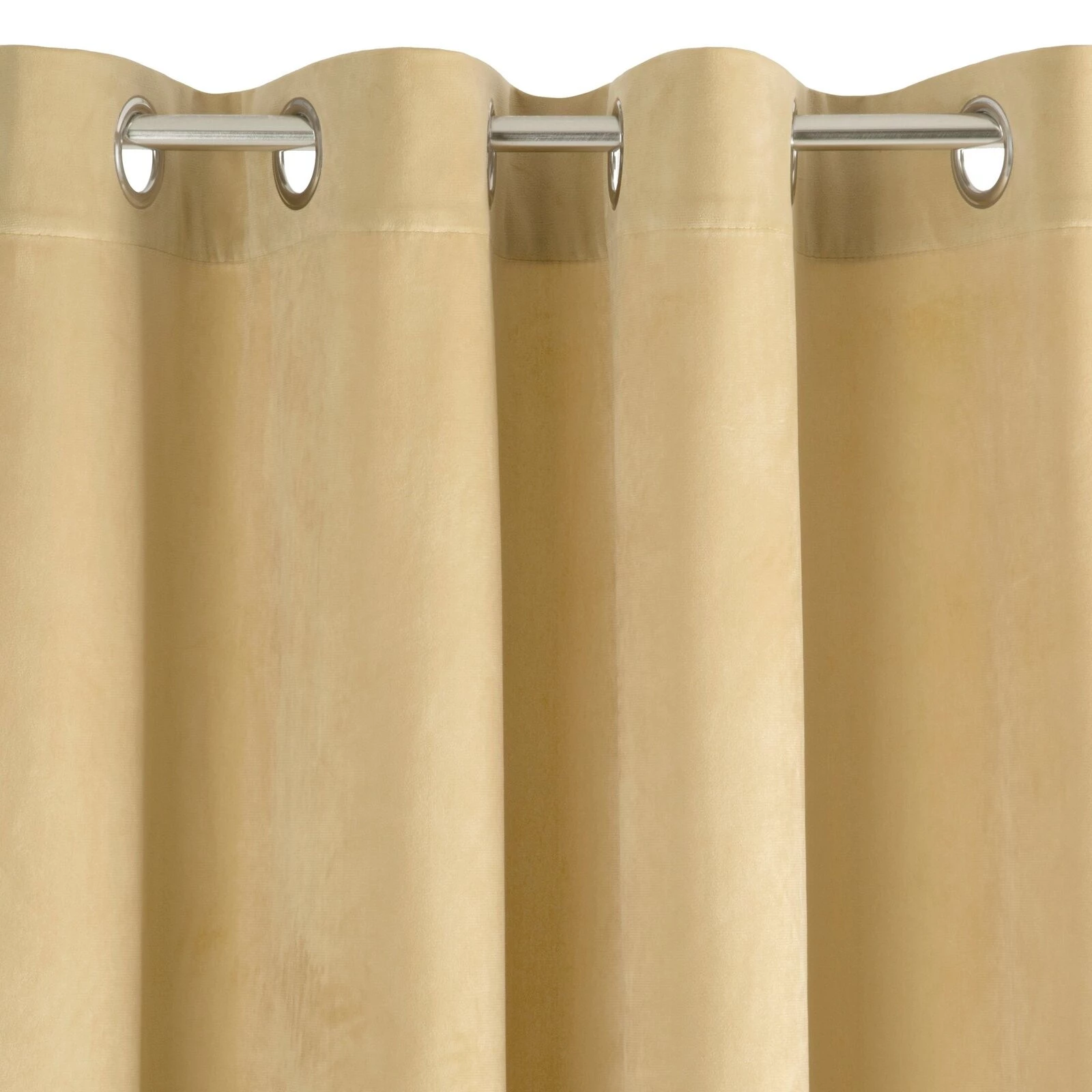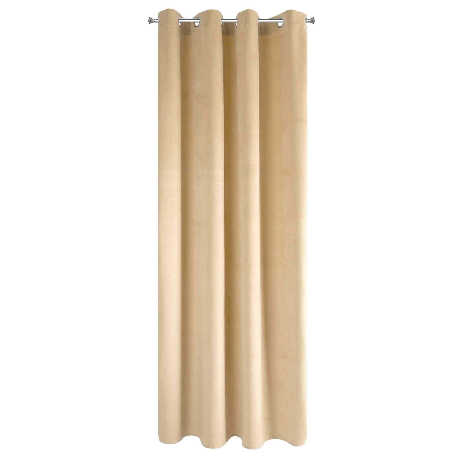 Miękka zasłona gotowa z jednokolorowego aksamitu o charakterystycznym dla welwetu połysku. Mięsista tkanina daje wysoki stopień zaciemnienia wnętrza. szerokość: 140 cm, długość: 250 cm, kolor: kremowy, Gramatura: 215 GSM, Skład: 100% poliester