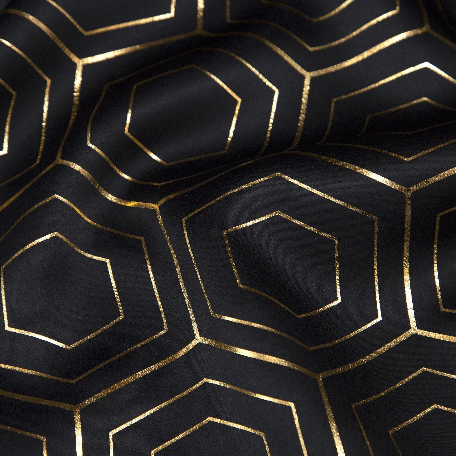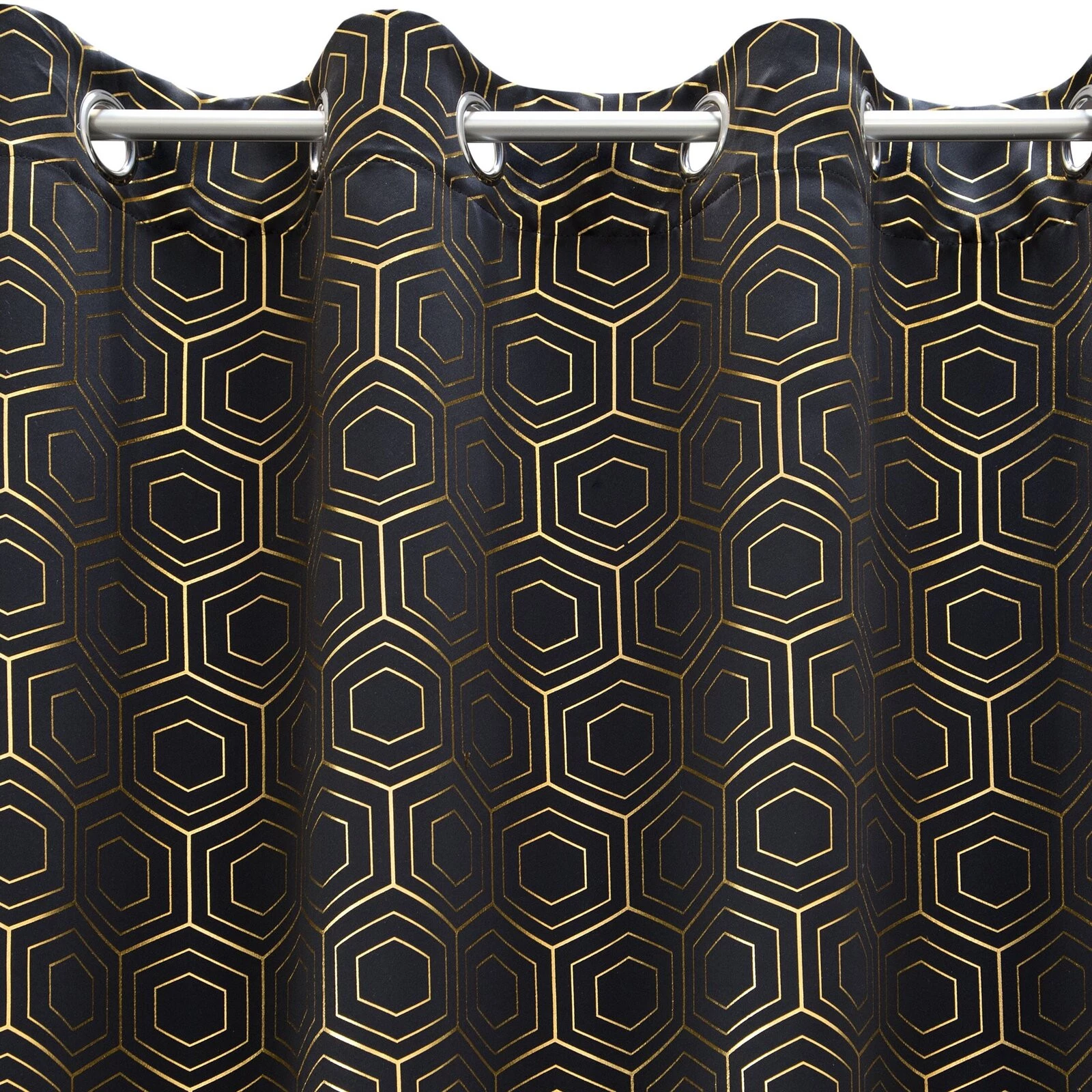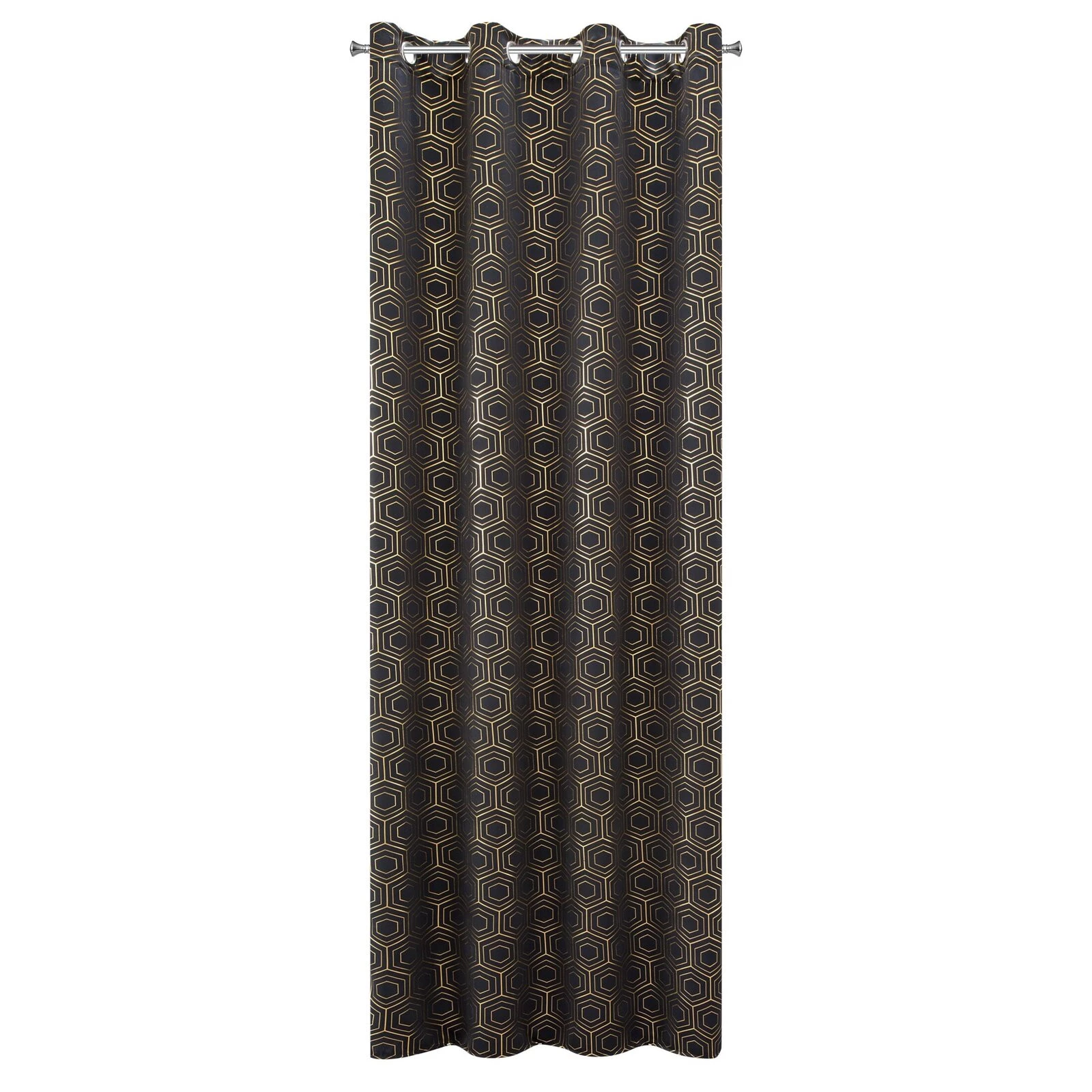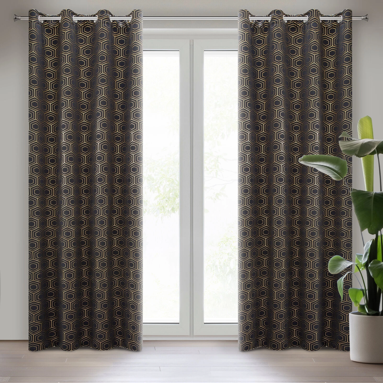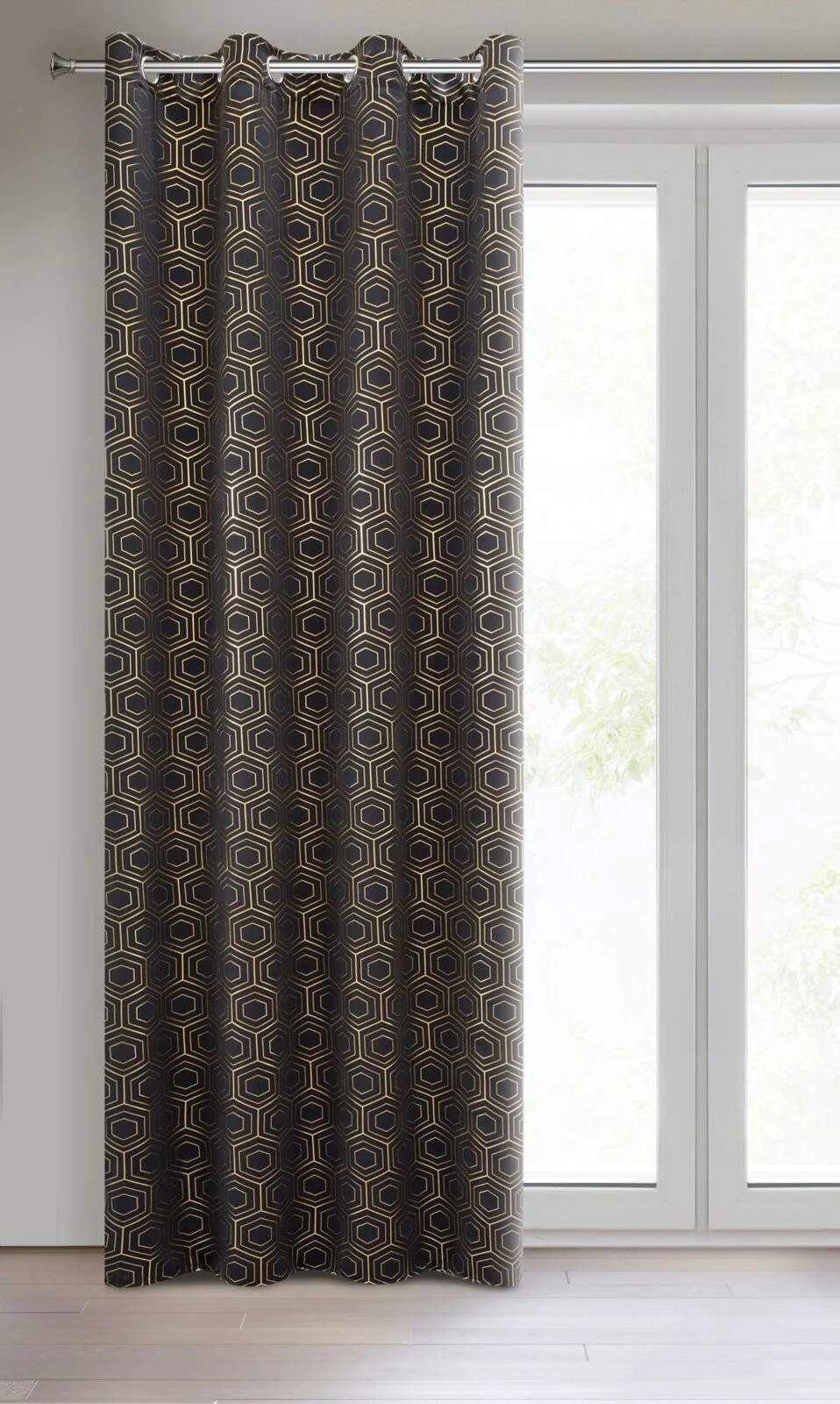 Zasłona zaciemniająca ze złotym, geometrycznym nadrukiem szerokość: 135 cm, długość: 250 cm, kolor: czarny, Gramatura: 190 GSM, Skład: 100% poliester