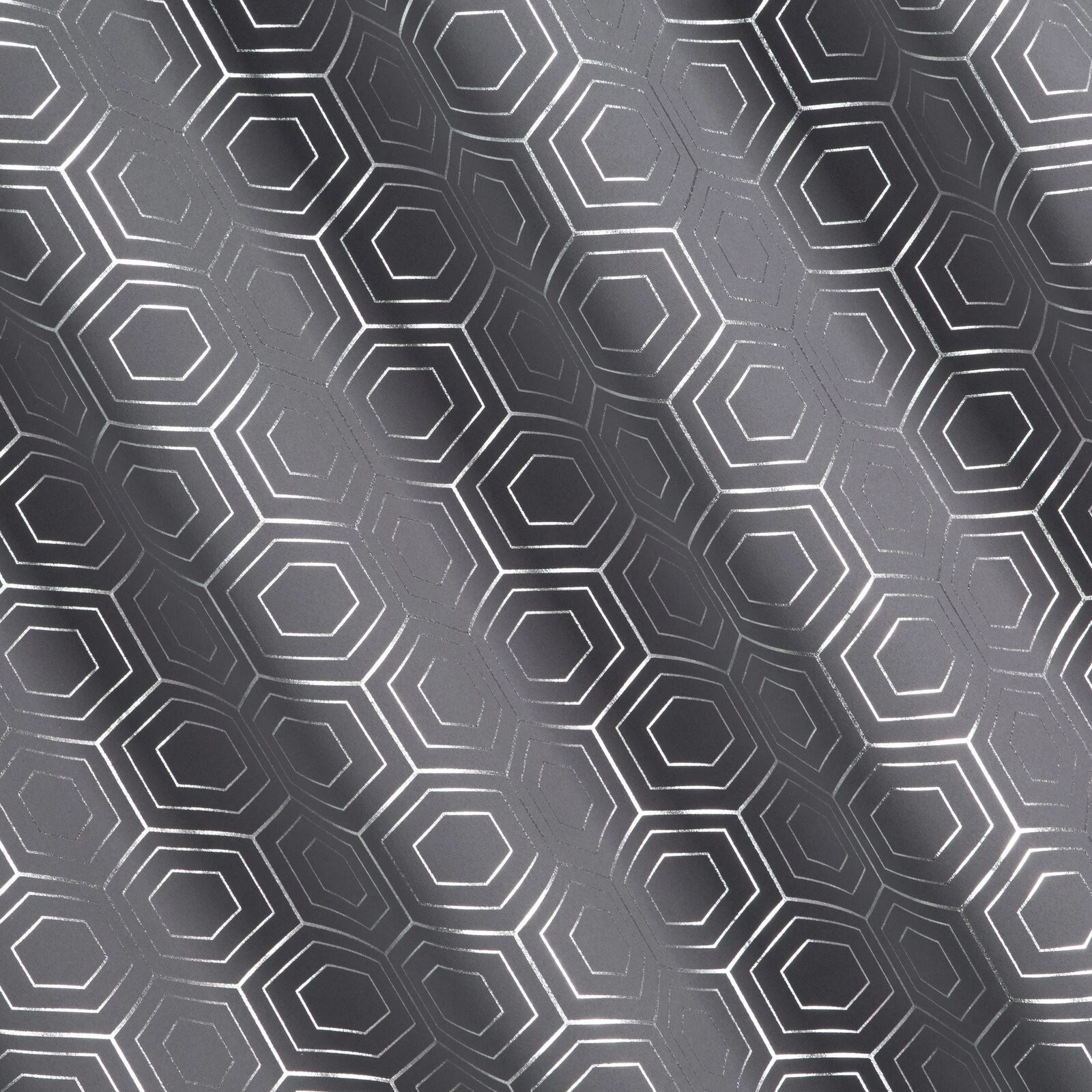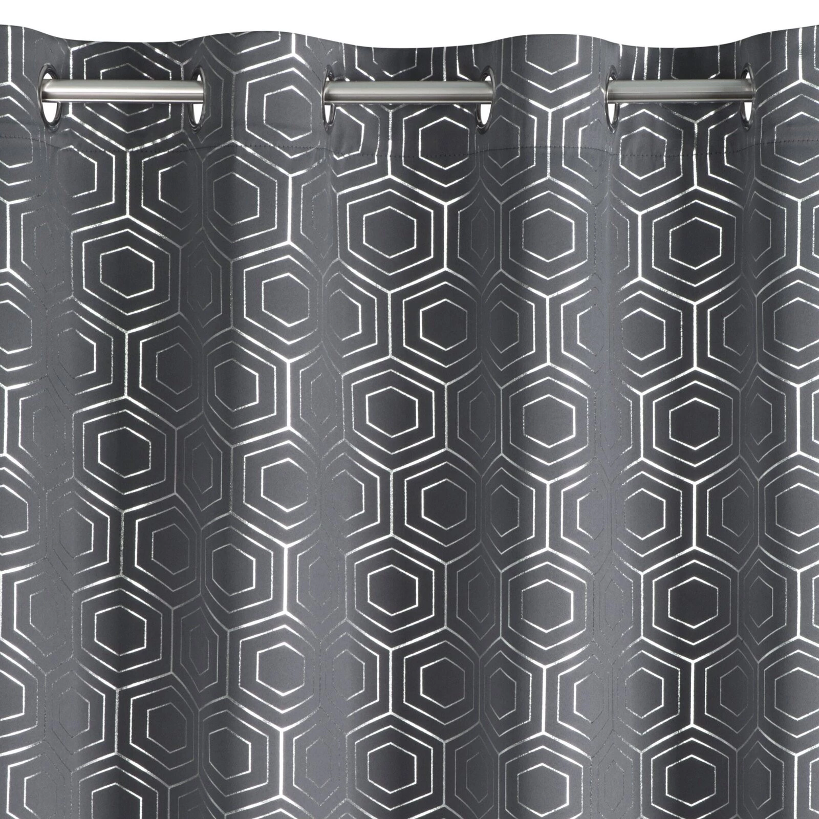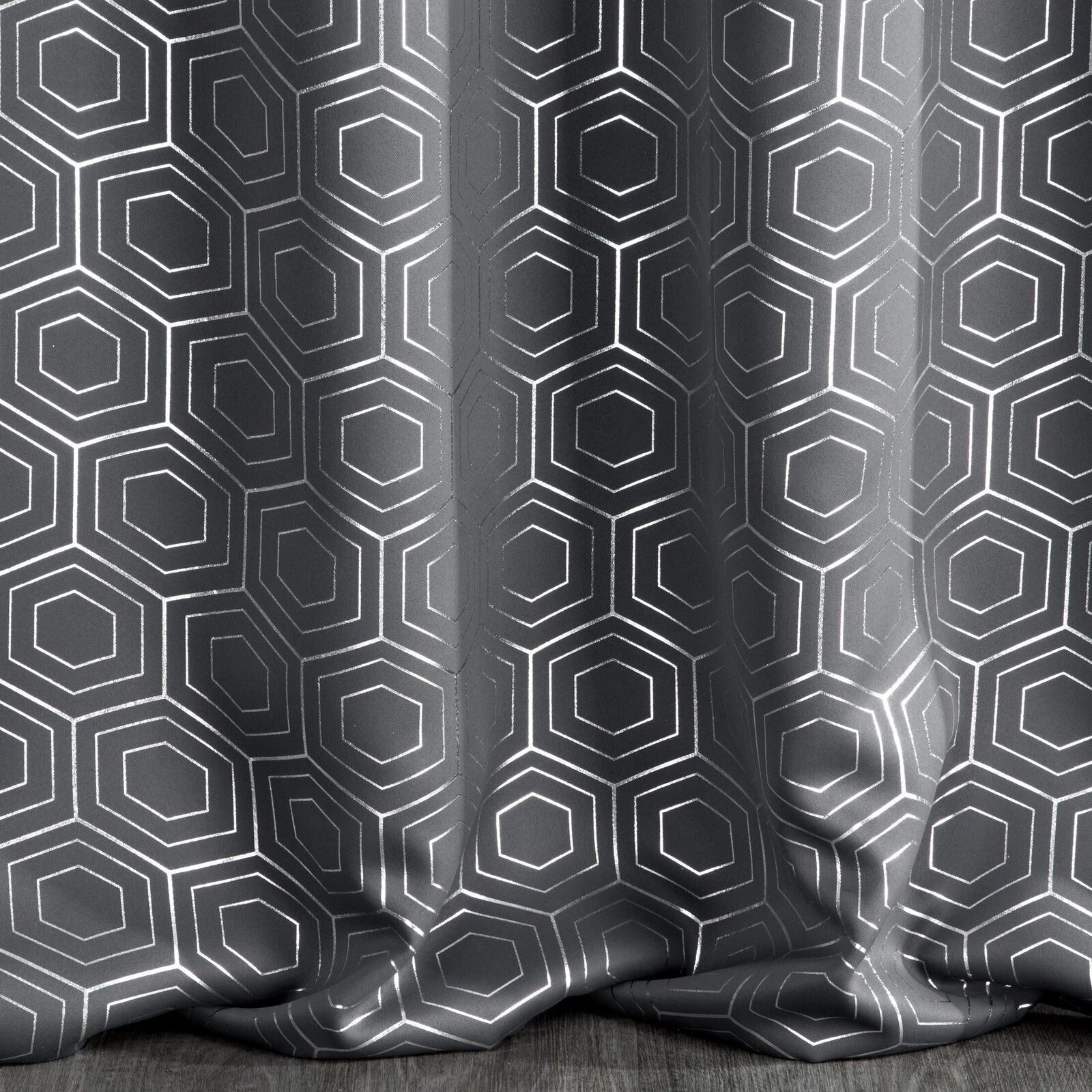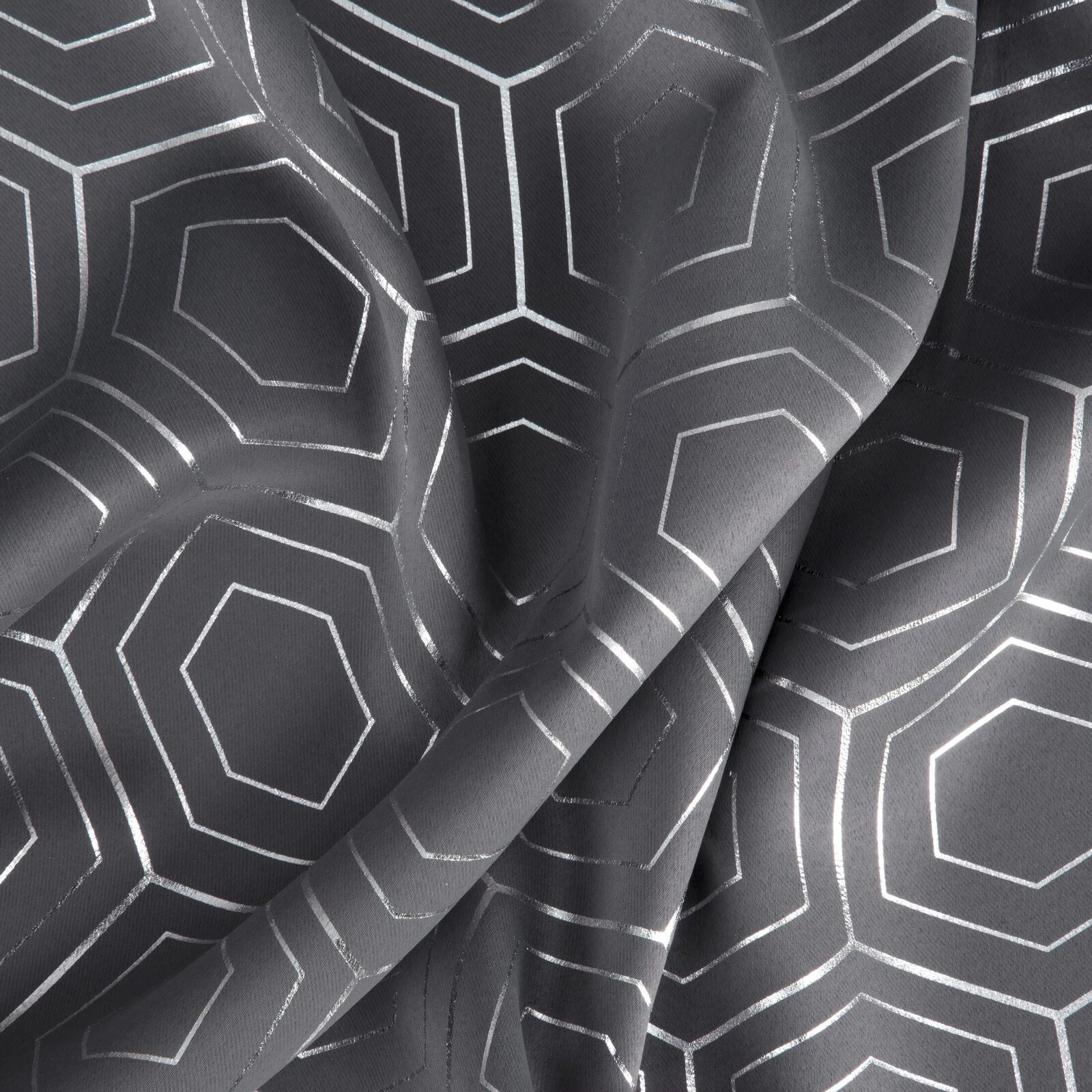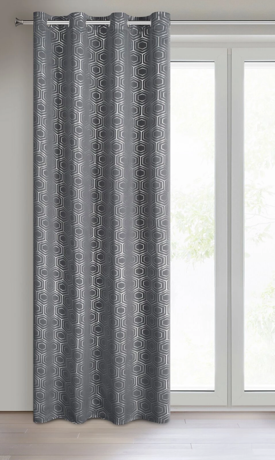 Zasłona zaciemniająca ze srebrnym, geometrycznym nadrukiem szerokość: 135 cm, długość: 250 cm, kolor: grafitowy, Gramatura: 195 GSM, Skład: 100% poliester