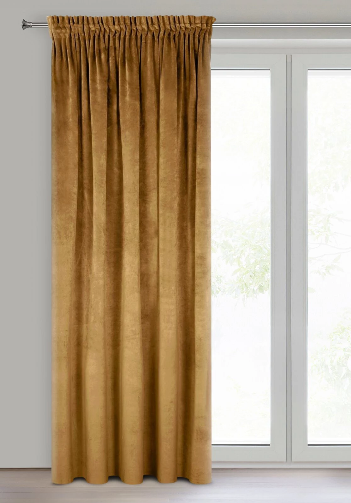 - Zasłona welwetowa jednokolorowa szerokość: 140 cm, długość: 270 cm, kolor: miodowy, Gramatura: 290 GSM, Skład: 100% poliester