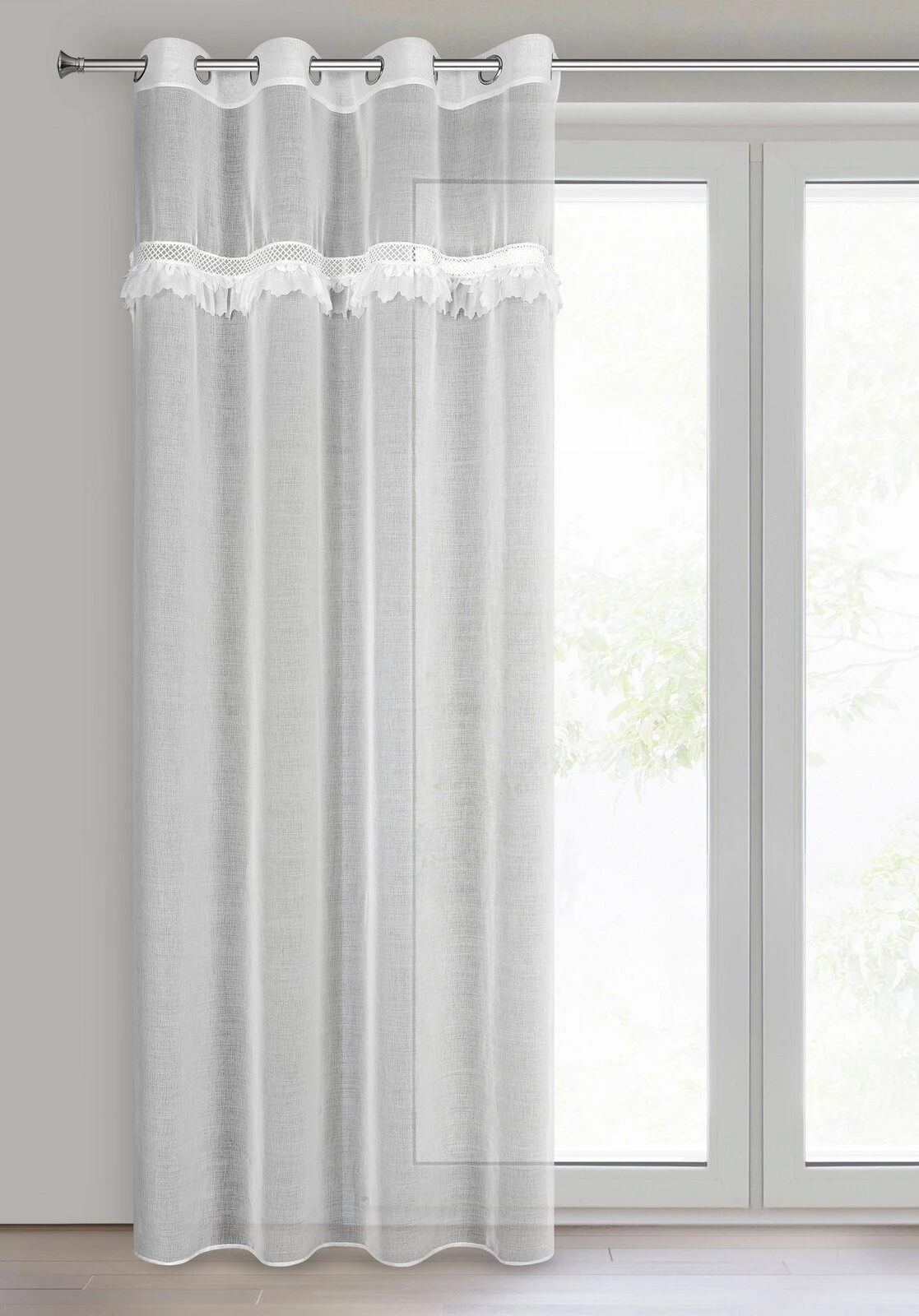 - Firana gotowa zdobiona obszywką szerokość: 140 cm, długość: 250 cm, kolor: biały, Gramatura: 68 GSM, Skład: 100% poliester