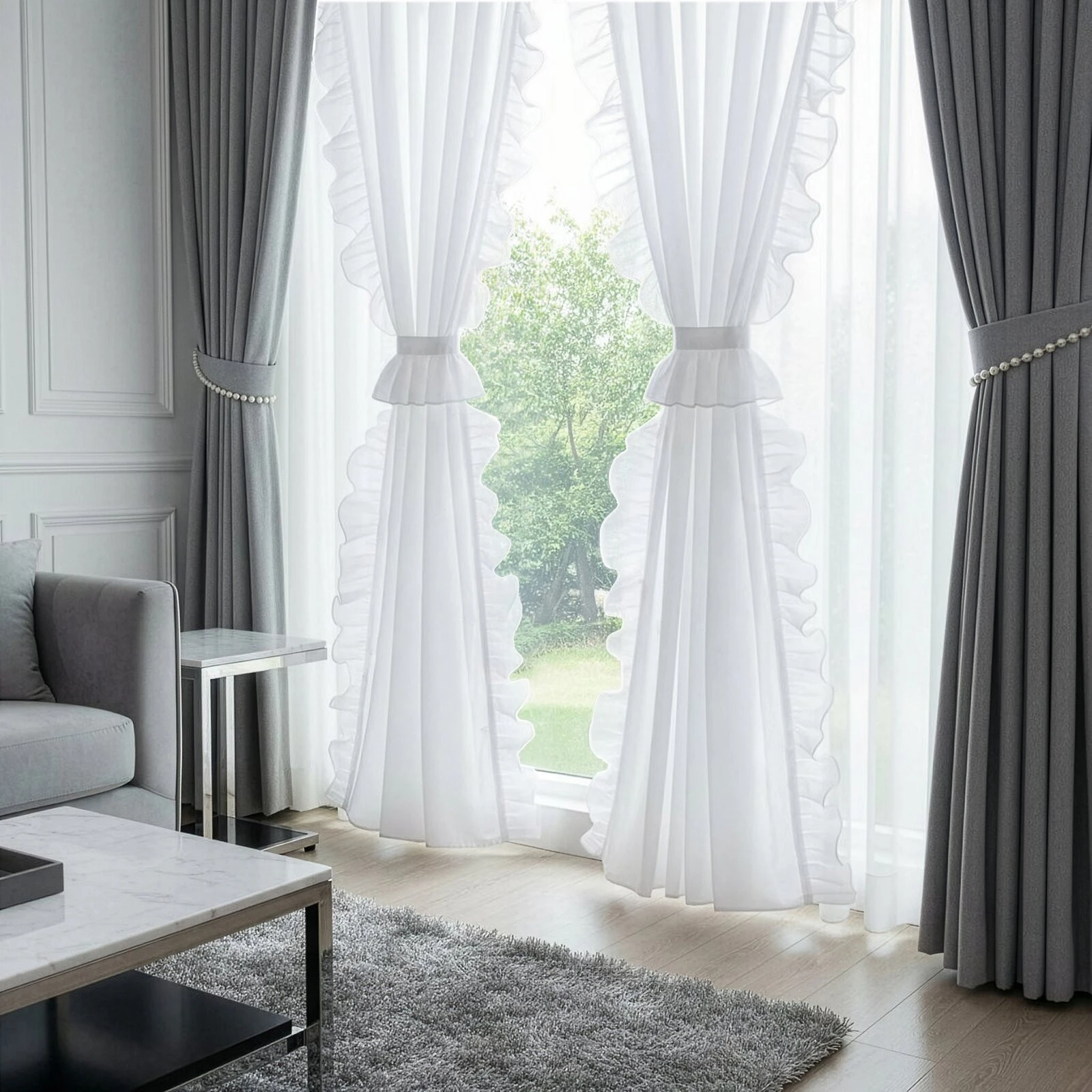 - Firana gotowa zdobiona po bokach falbankami z dekoracyjnym troczkiem szerokość: 140 cm, długość: 270 cm, kolor: biały, Gramatura: 40 GSM, Skład: 100% poliester