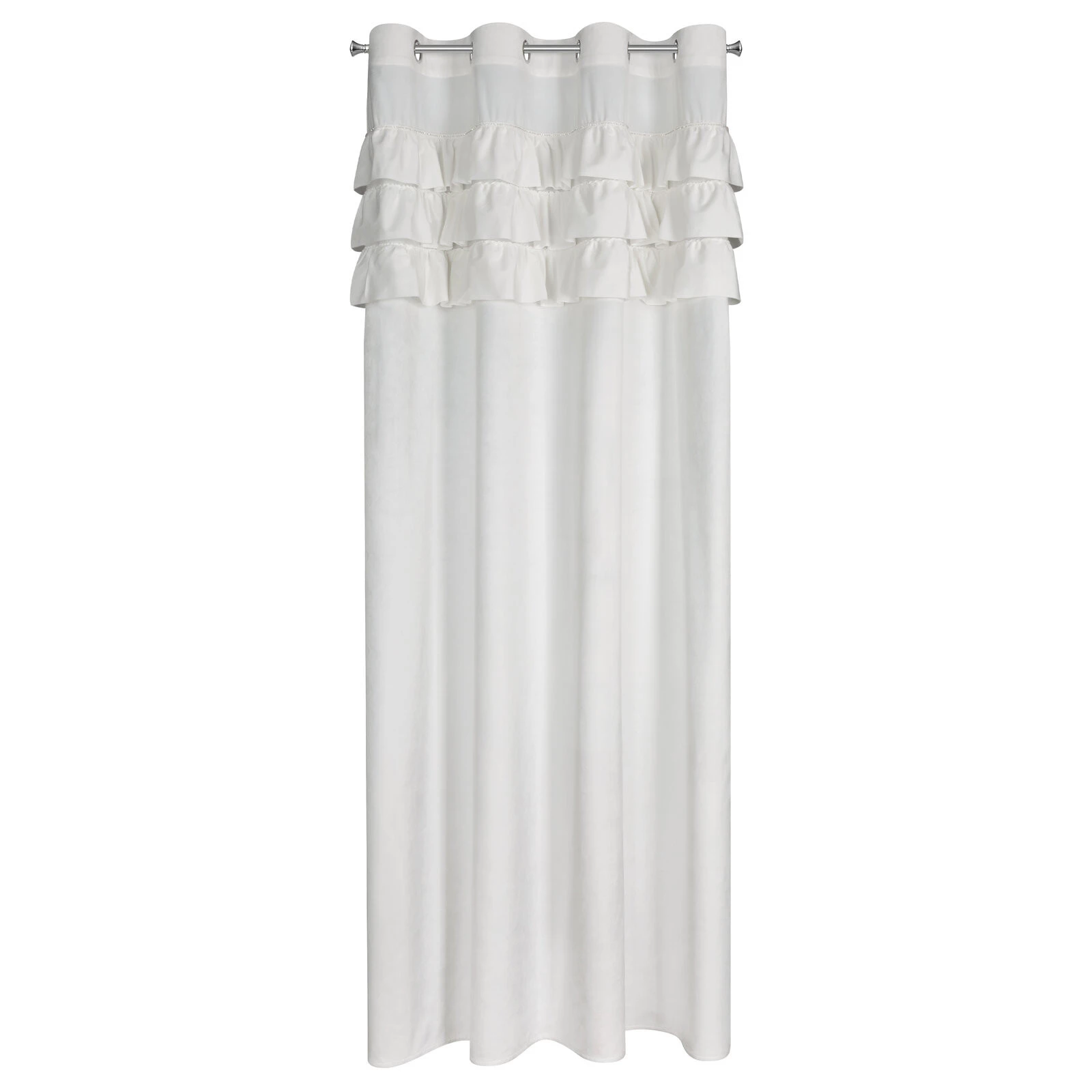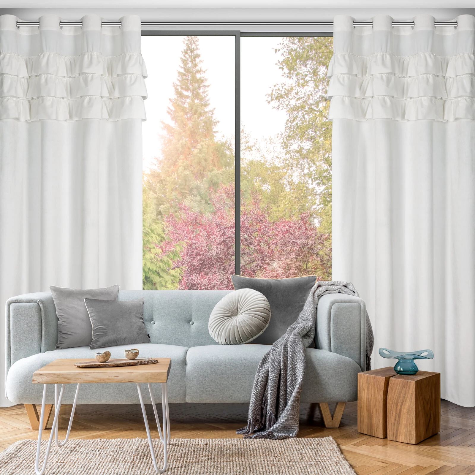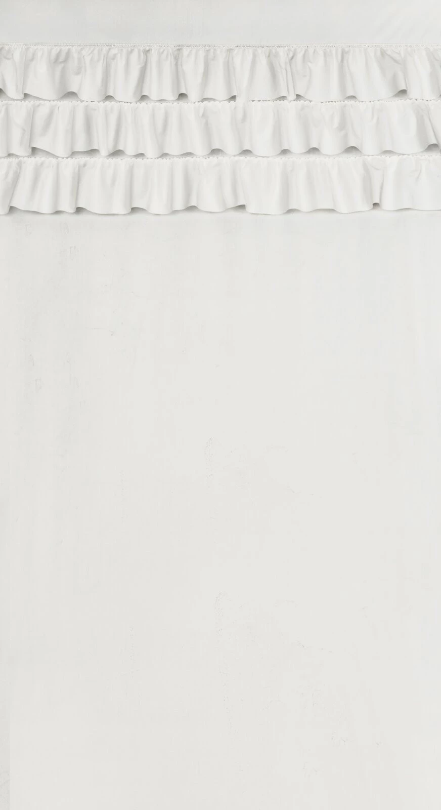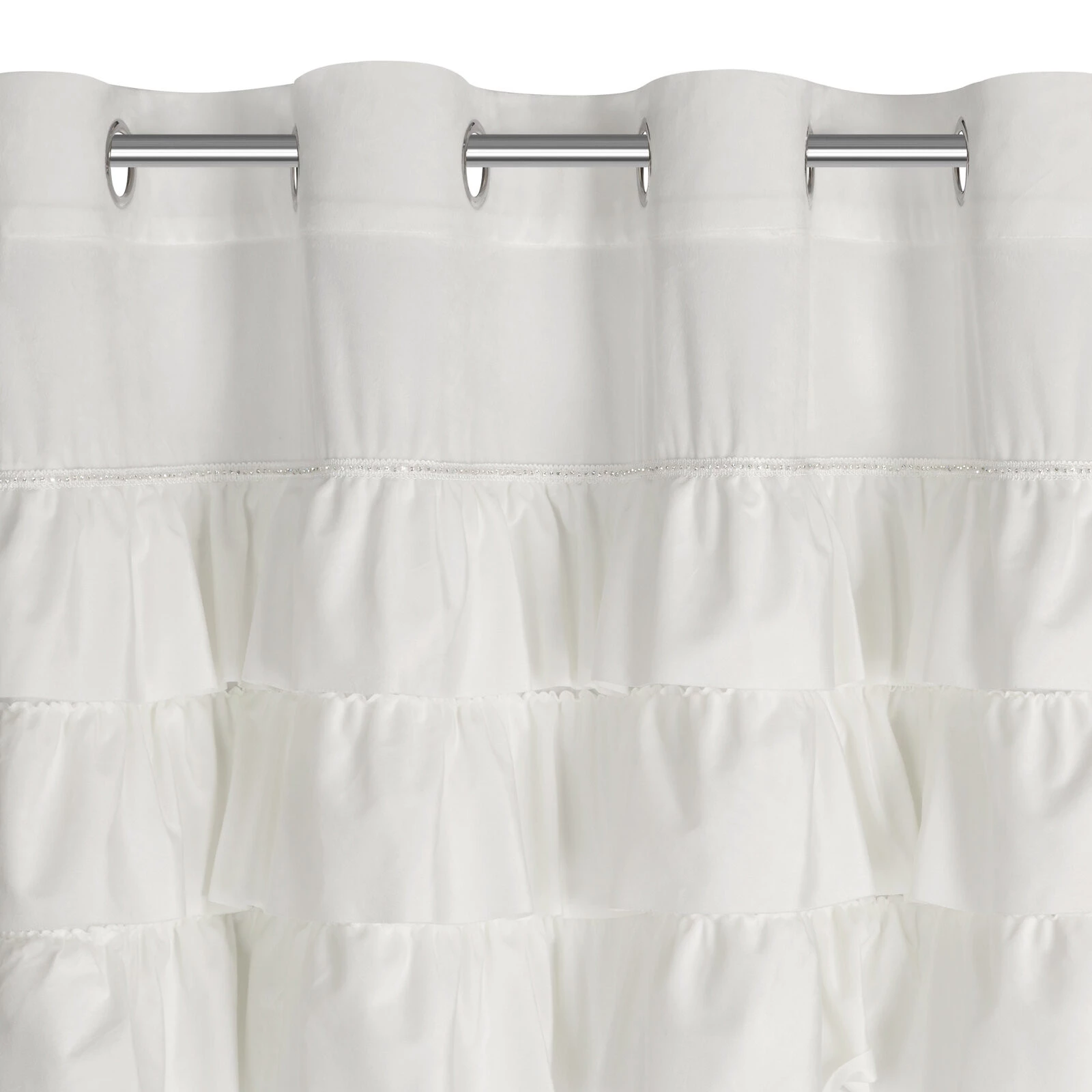 - Zasłona gotowa zdobiona w górnej części falbanami i taśmą z cyrkoniami szerokość: 140 cm, długość: 250 cm, kolor: biały, Gramatura: 200 GSM, Skład: 100% poliester