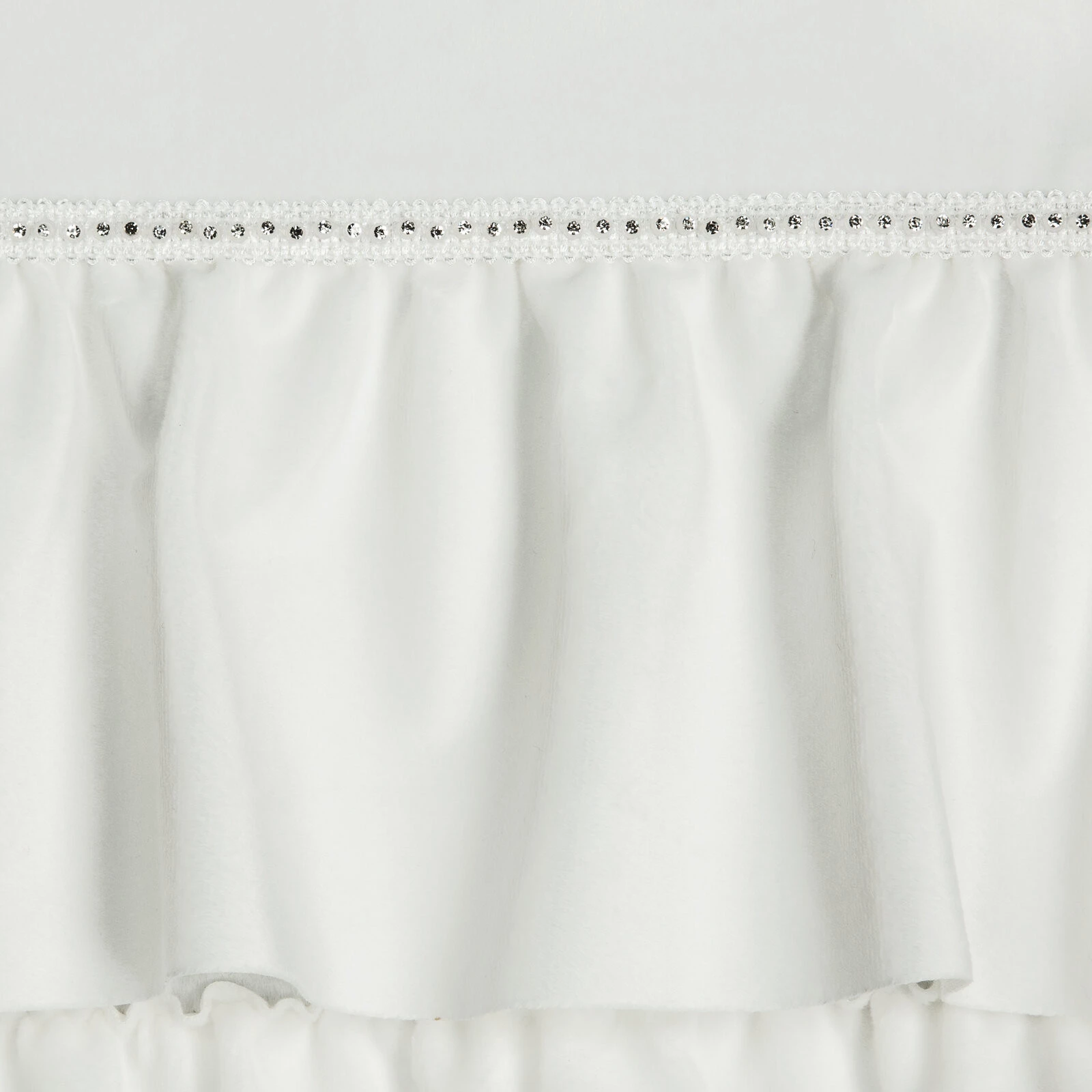 Zasłona gotowa zdobiona w górnej części falbanami i taśmą z cyrkoniami szerokość: 140 cm, długość: 250 cm, kolor: biały, Gramatura: 200 GSM, Skład: 100% poliester