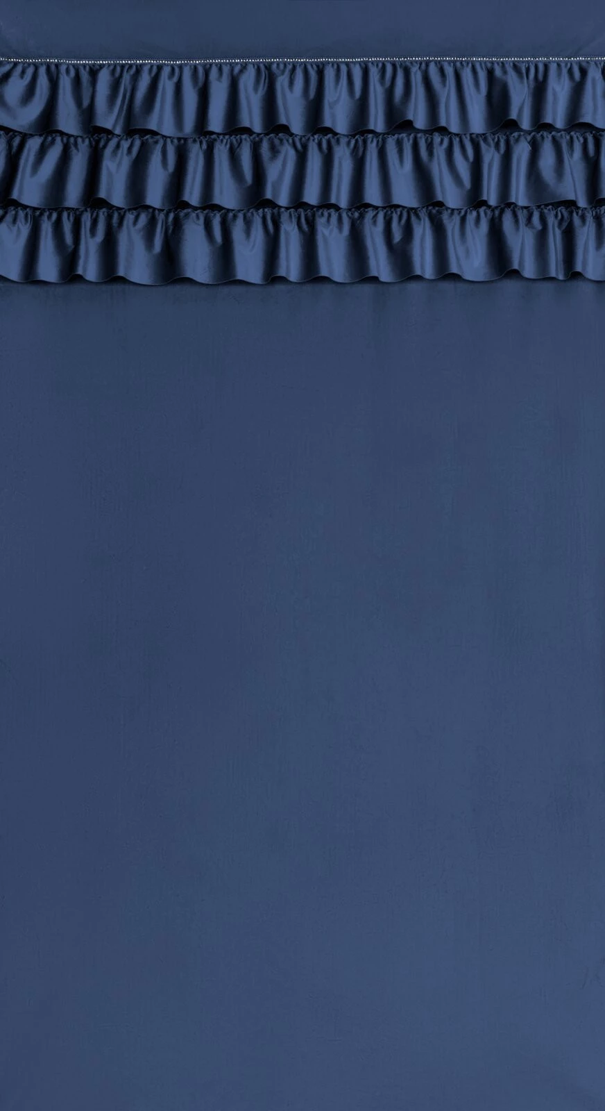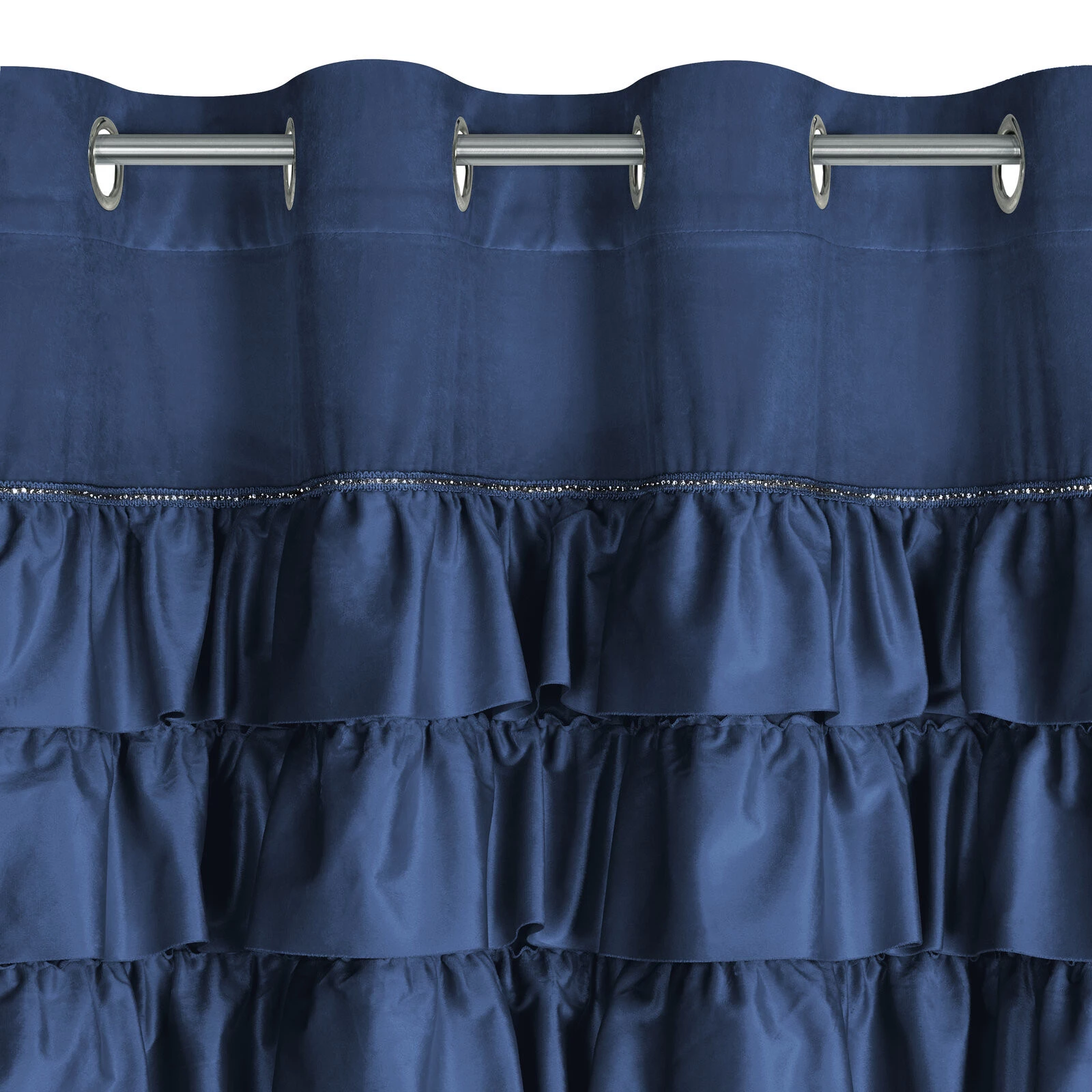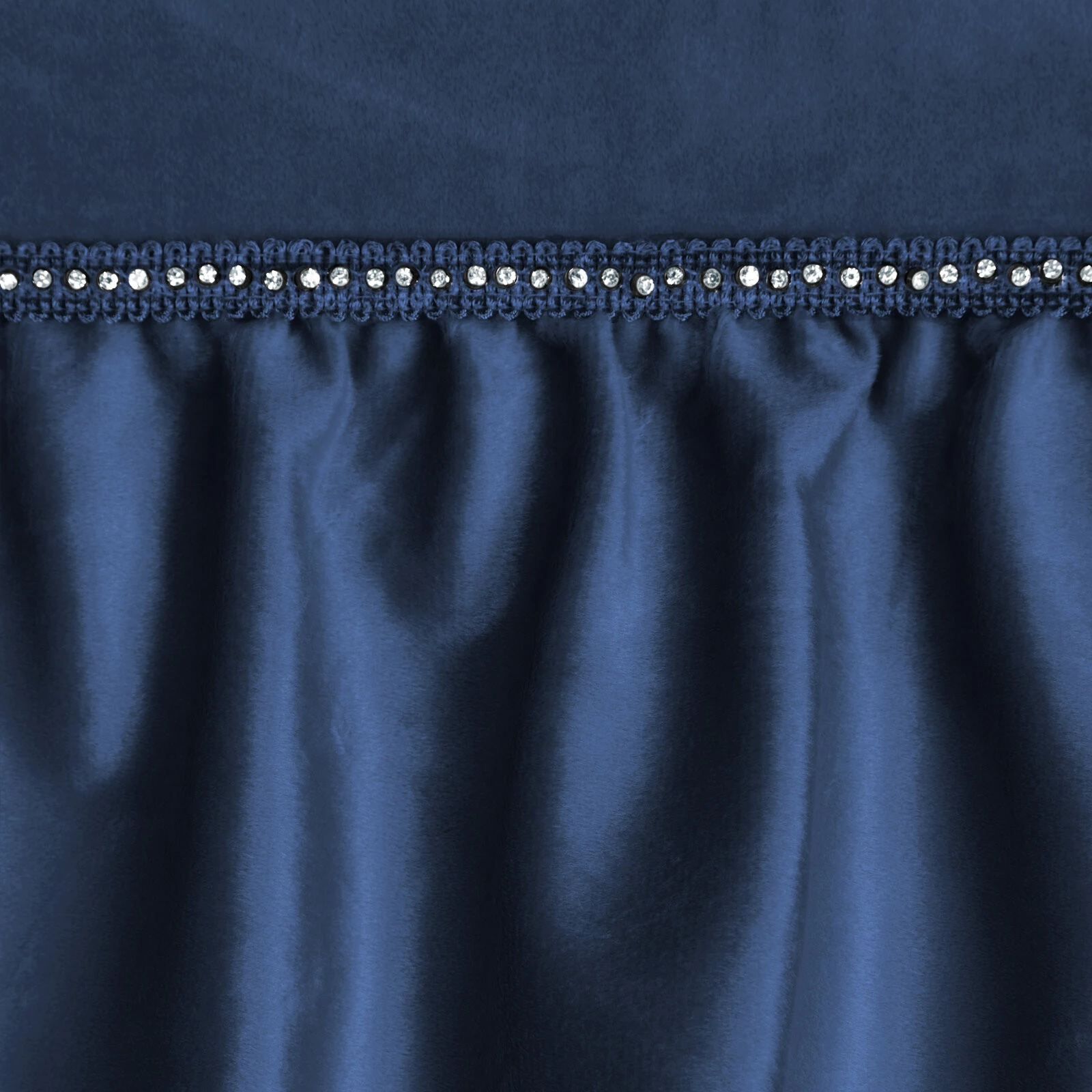 - Zasłona gotowa zdobiona w górnej części falbanami i taśmą z cyrkoniami szerokość: 140 cm, długość: 250 cm, kolor: granatowy, Gramatura: 200 GSM, Skład: 100% poliester