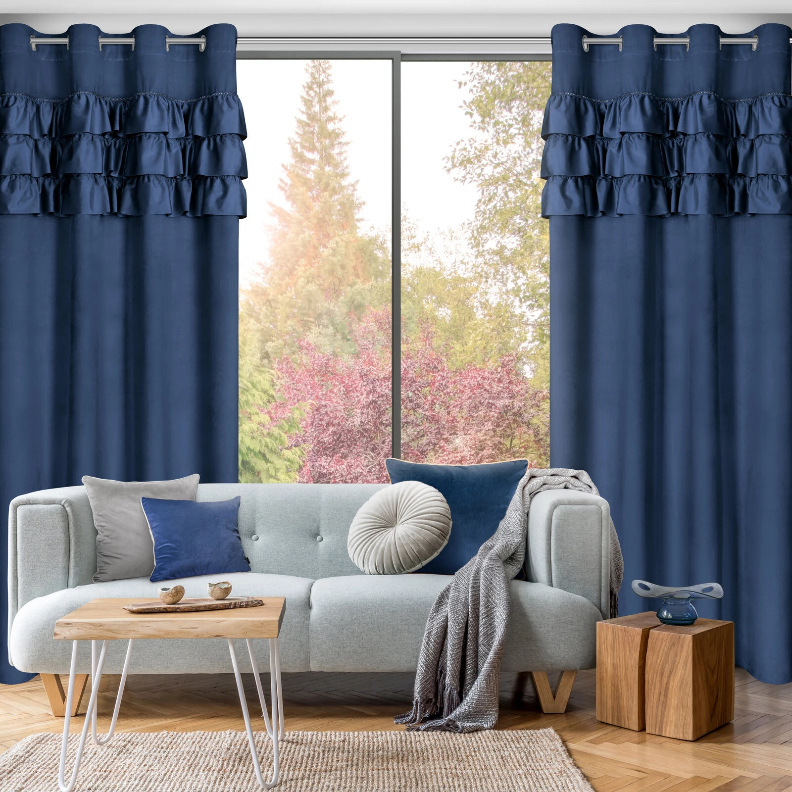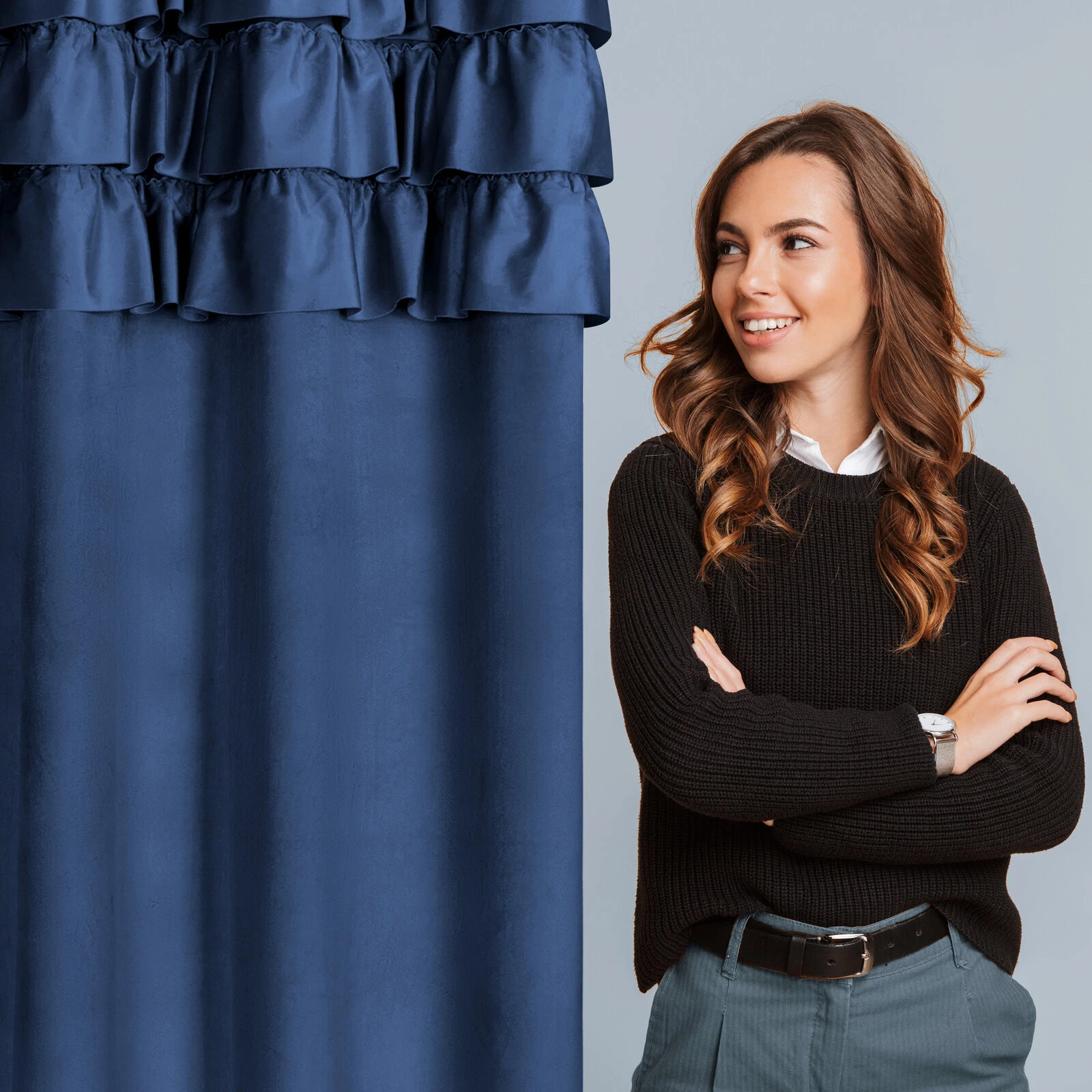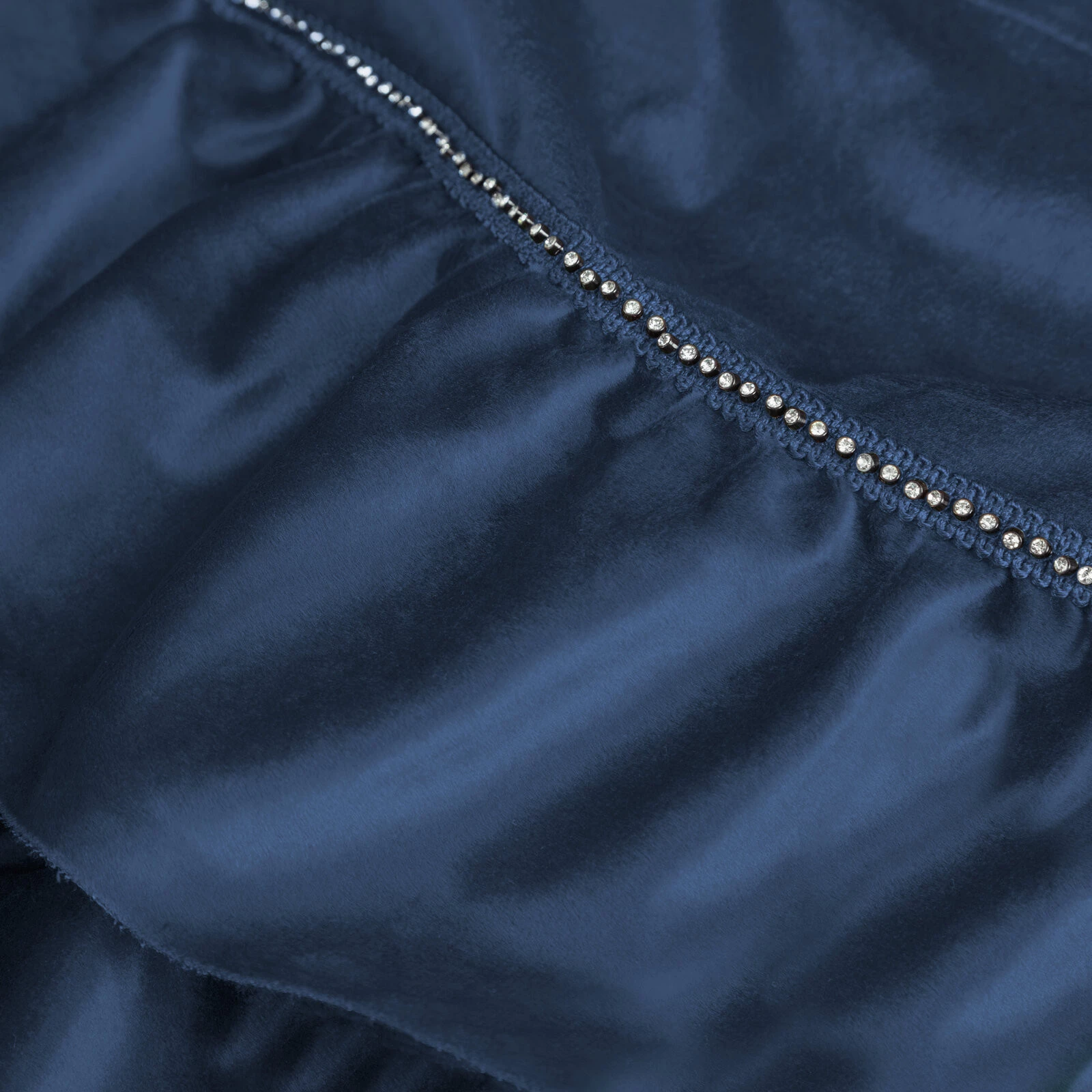 - Zasłona gotowa zdobiona w górnej części falbanami i taśmą z cyrkoniami szerokość: 140 cm, długość: 250 cm, kolor: granatowy, Gramatura: 200 GSM, Skład: 100% poliester