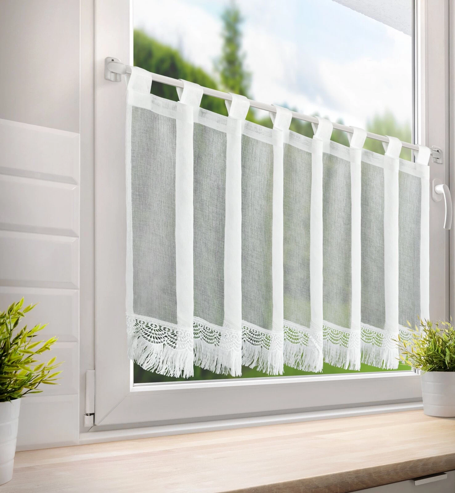 - Zazdrostka gotowa z ozdobną obszywką z frędzlami szerokość: 60 cm, długość: 150 cm, kolor: biały, Skład: 100% poliester
