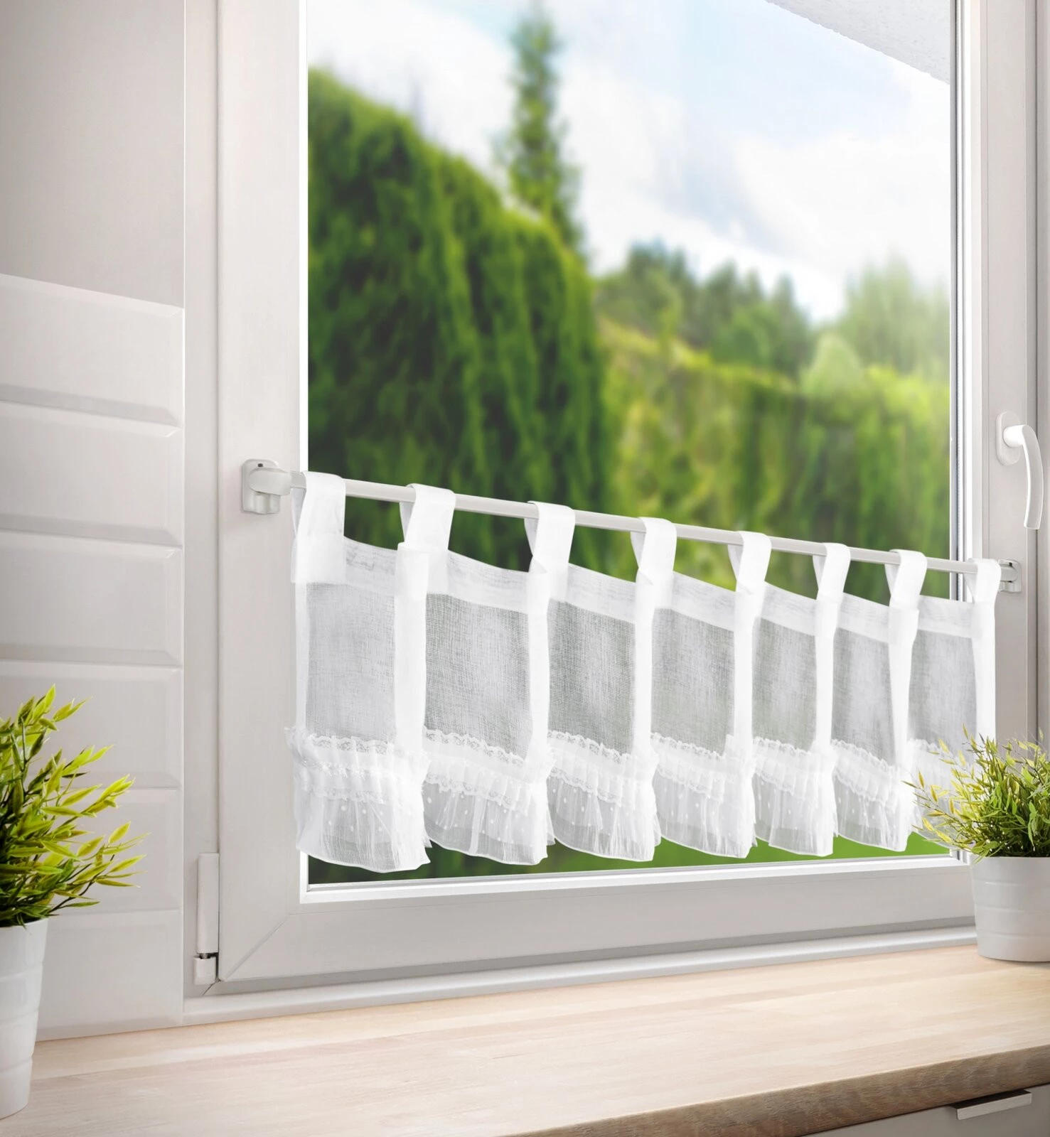 - Firana gotowa z ozdobną obszywką szerokość: 150 cm, długość: 30 cm, kolor: biały, Skład: 100% poliester