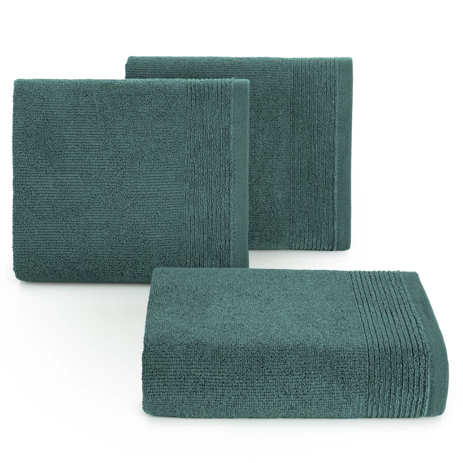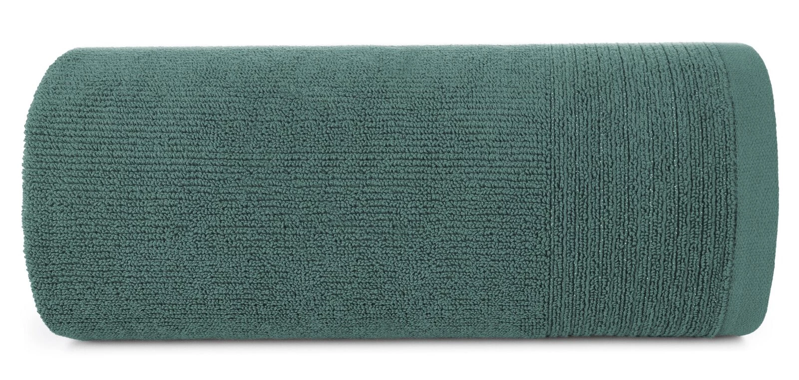 Ręcznik bawełniany z ozdobną bordiurą przetykaną błyszczącą nicią szerokość: 50 cm, długość: 90 cm, kolor: ciemnomiętowy, Gramatura: 500 GSM, Skład: 100% bawełna; część ozdobna: 95% bawełna, 5% poliester