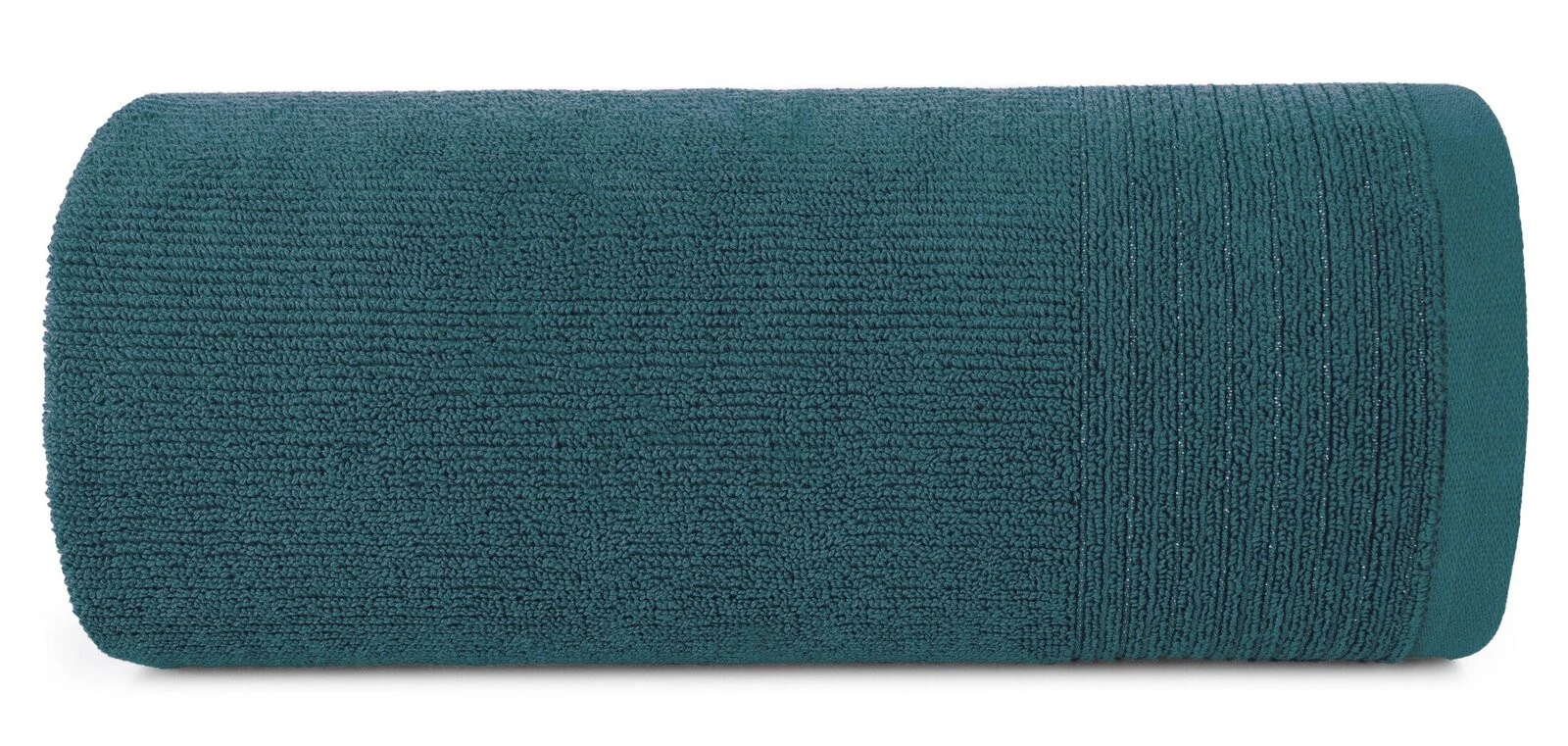 Ręcznik bawełniany z ozdobną bordiurą przetykaną błyszczącą nicią szerokość: 70 cm, długość: 140 cm, kolor: ciemnoturkusowy, Gramatura: 500 GSM, Skład: 100% bawełna; część ozdobna: 95% bawełna, 5% poliester