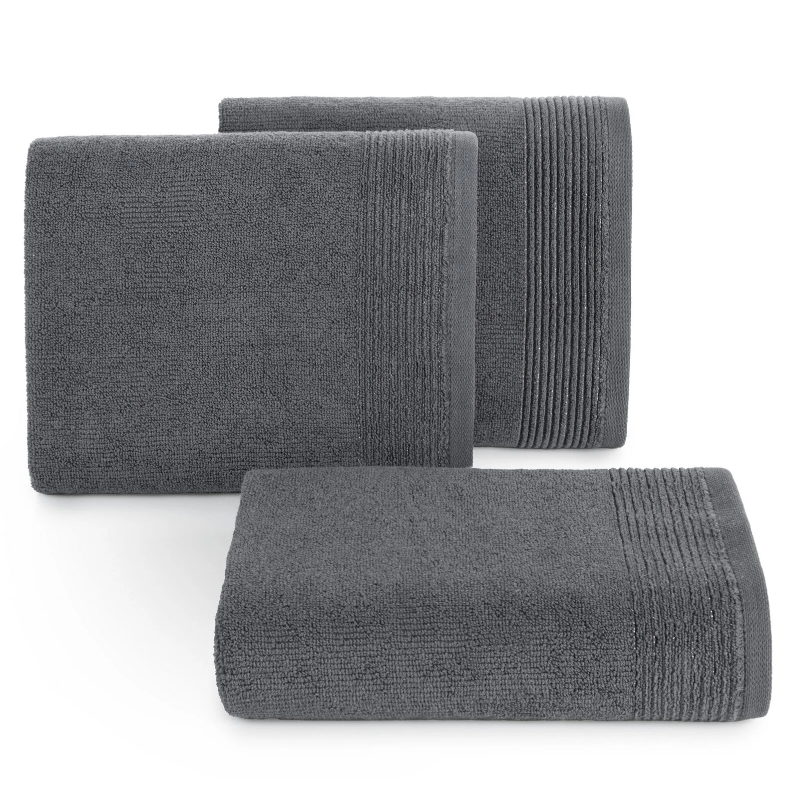 Ręcznik bawełniany z ozdobną bordiurą przetykaną błyszczącą nicią szerokość: 50 cm, długość: 90 cm, kolor: stalowy, Gramatura: 500 GSM, Skład: 100% bawełna; część ozdobna: 95% bawełna, 5% poliester