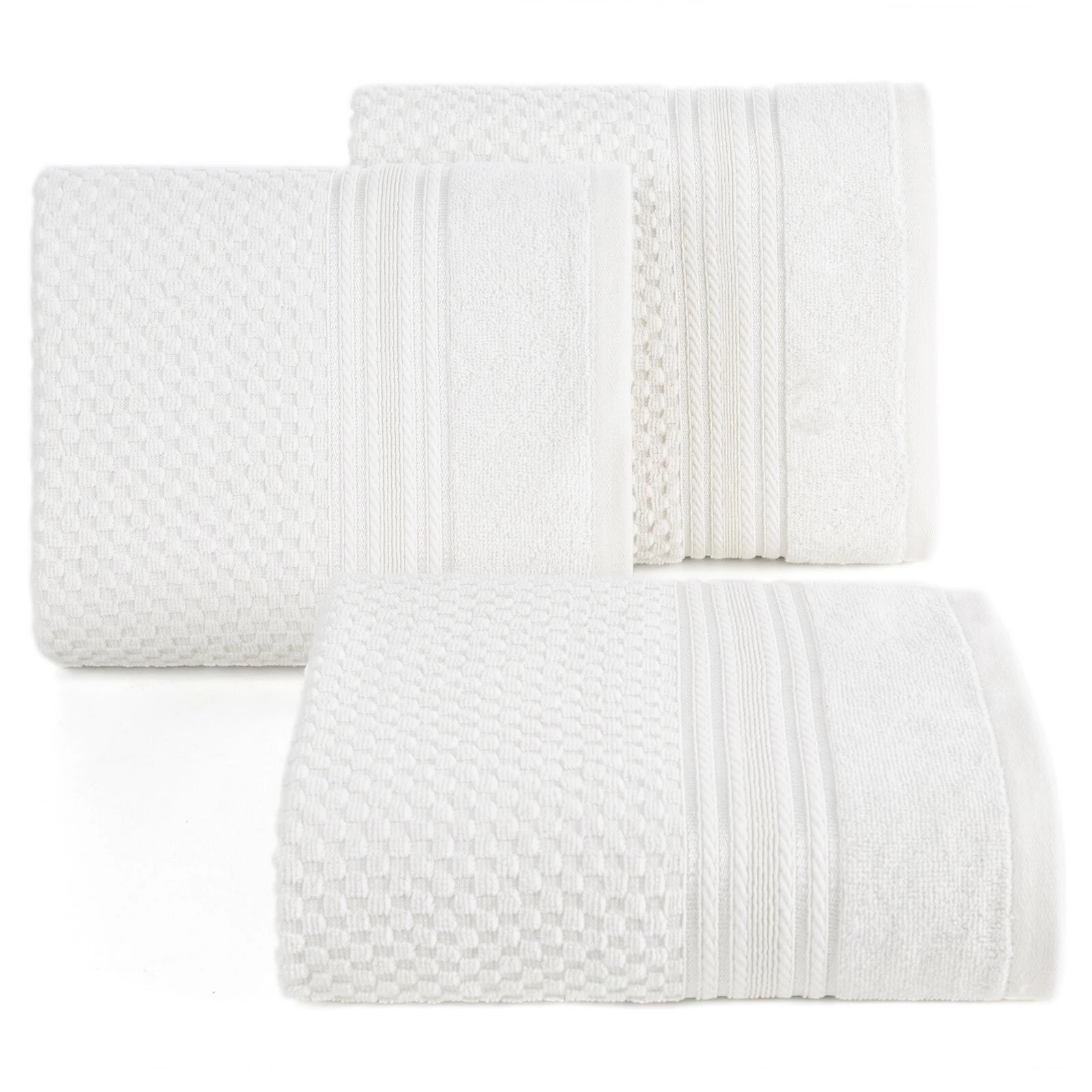 Jednobarwny ręcznik z miękkiej i chłonnej tkaniny bawełnianej o splocie frotte zdobiony kolorową bordiurą w stylu fastrygi. Łatwy w praniu, nie farbuje. szerokość: 70 cm, długość: 140 cm, kolor: kremowy, Gramatura: 500 GSM, Skład: 100% bawełna