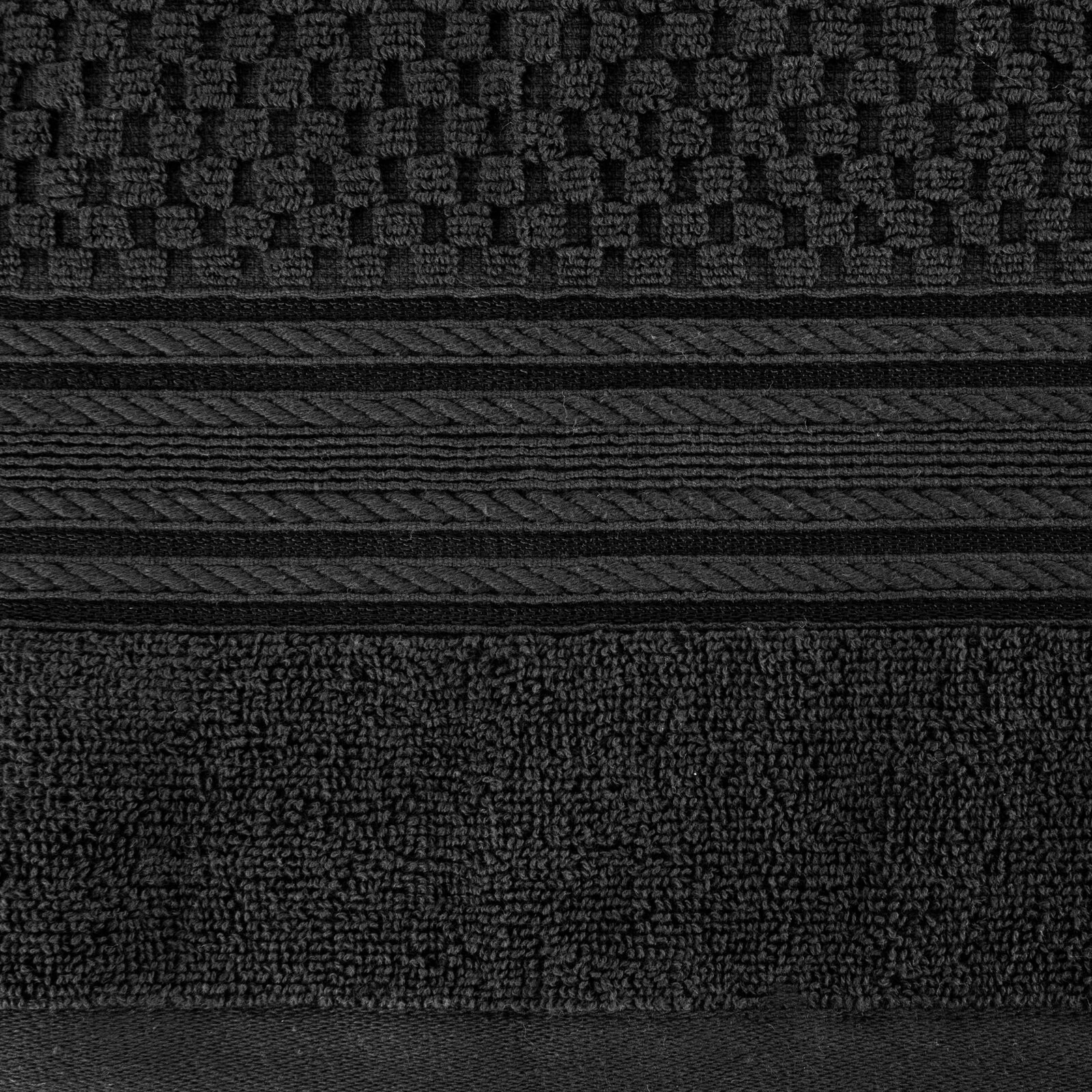 Jednobarwny ręcznik z miękkiej i chłonnej tkaniny bawełnianej o splocie frotte zdobiony kolorową bordiurą w stylu fastrygi. Łatwy w praniu, nie farbuje. szerokość: 70 cm, długość: 140 cm, kolor: czarny, Gramatura: 500 GSM, Skład: 100% bawełna