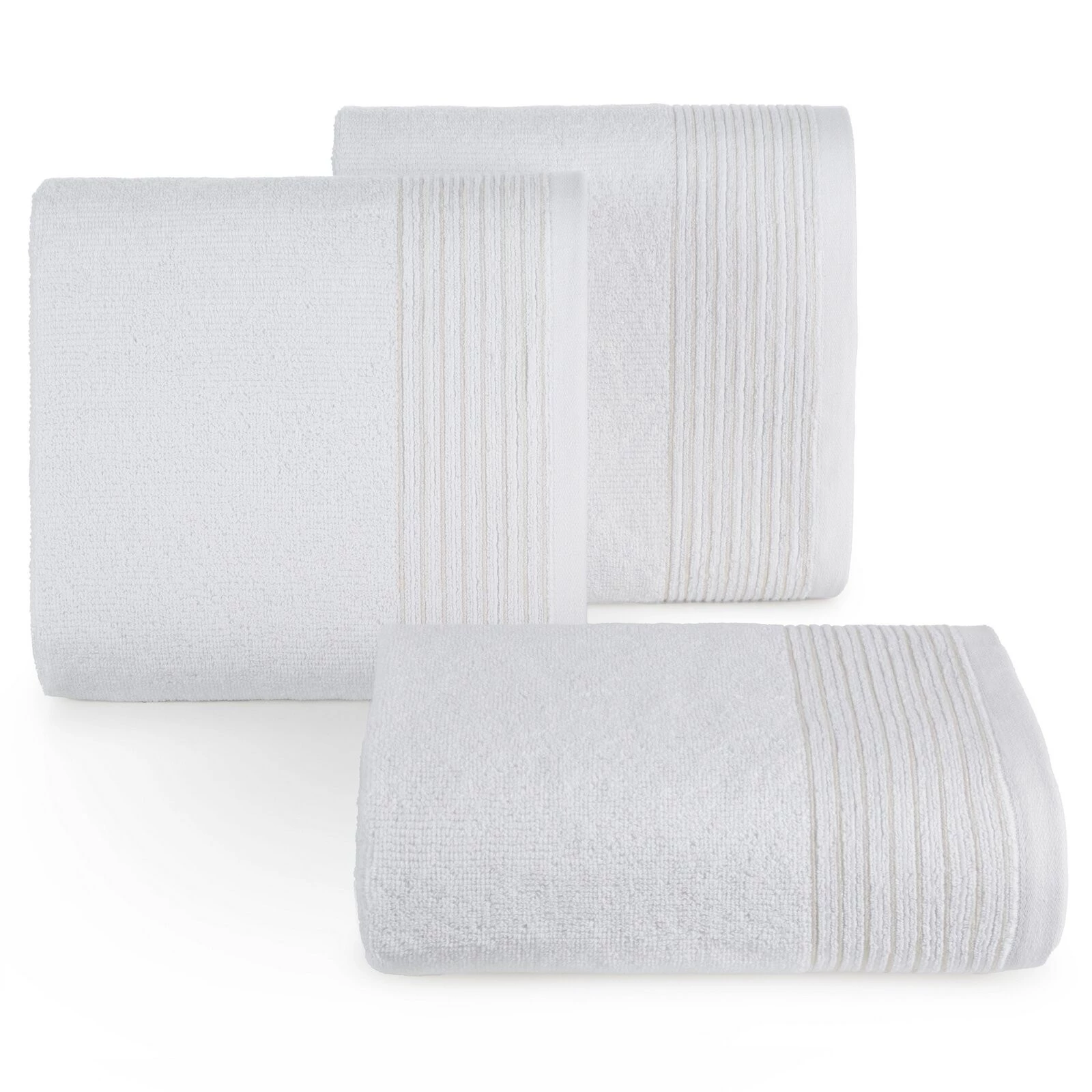 Ręcznik bawełniany z ozdobną bordiurą przetykaną błyszczącą nicią szerokość: 50 cm, długość: 90 cm, kolor: biały, Gramatura: 500 GSM, Skład: 100% bawełna; część ozdobna: 95% bawełna, 5% poliester