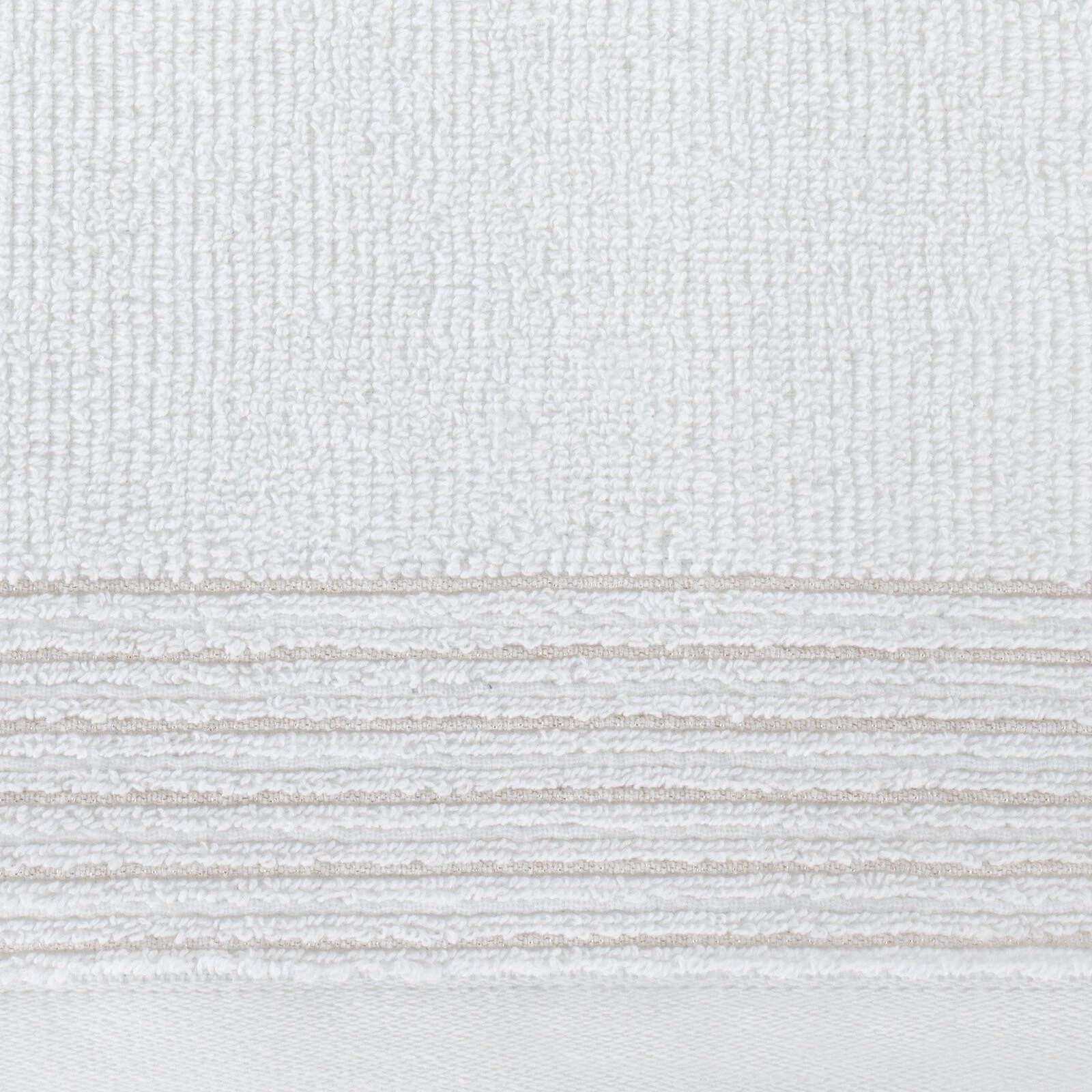 Ręcznik bawełniany z ozdobną bordiurą przetykaną błyszczącą nicią szerokość: 70 cm, długość: 140 cm, kolor: biały, Gramatura: 500 GSM, Skład: 100% bawełna; część ozdobna: 95% bawełna, 5% poliester