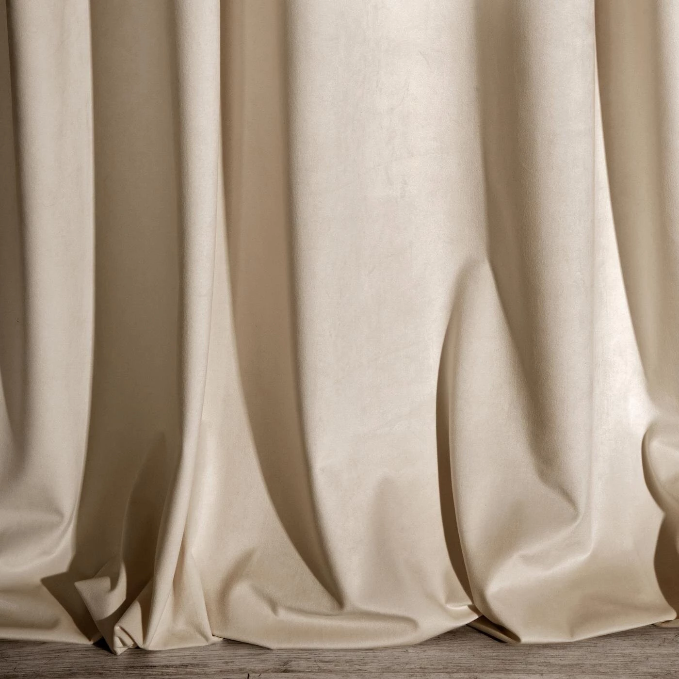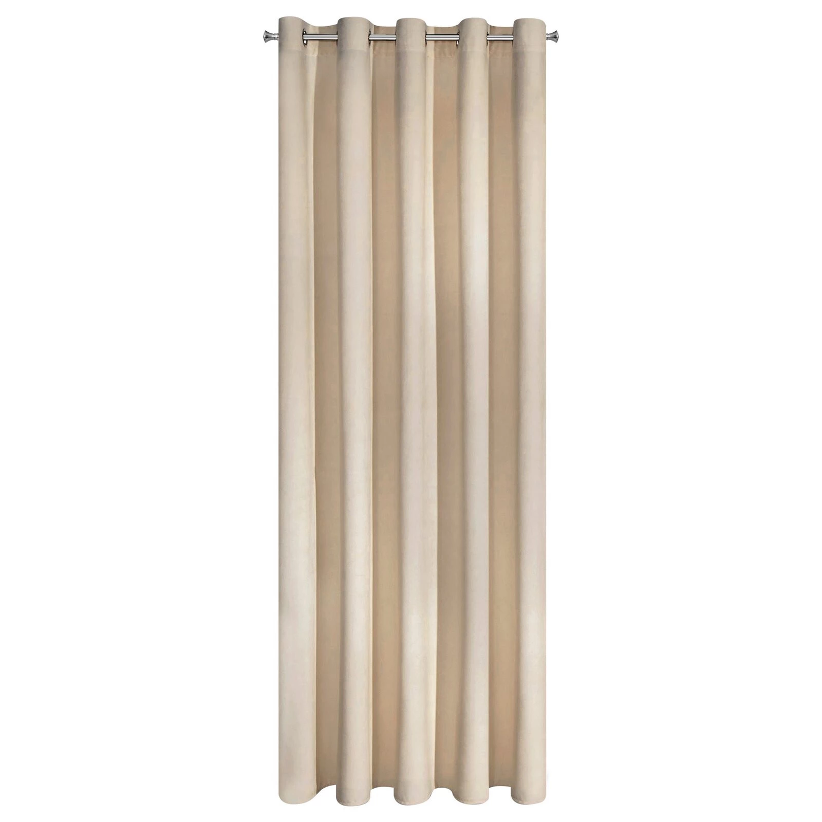 Gładka, jednokolorowa zasłona z miękkiego welwetu o charakterystycznym dla aksamitu połysku. Aż 10 szerokich przelotek umożliwia proste upięcie dekoracji okna. szerokość: 140 cm, długość: 250 cm, kolor: beżowy, Gramatura: 290 GSM, Skład: 100% poliester