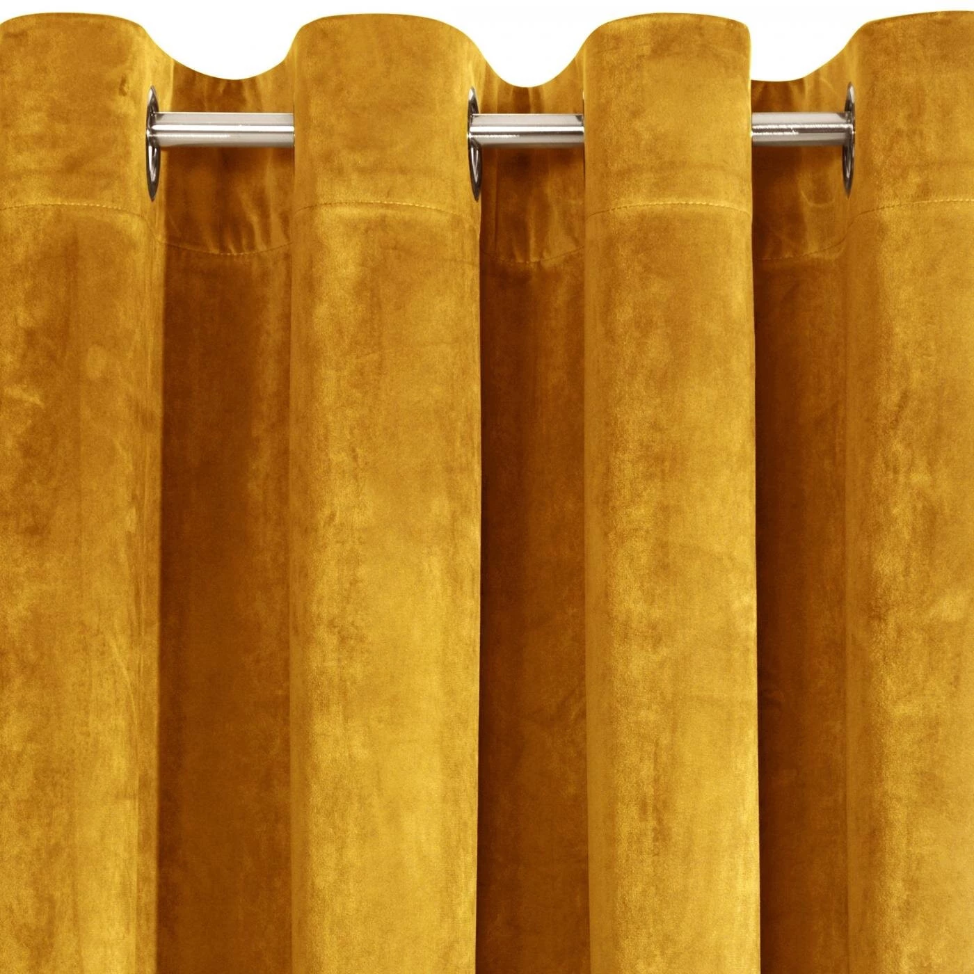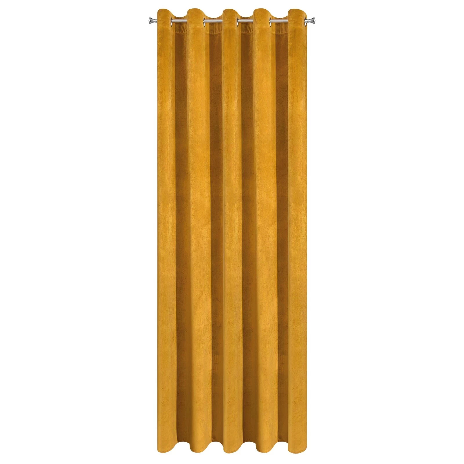 Gładka, jednokolorowa zasłona z miękkiego welwetu o charakterystycznym dla aksamitu połysku. Aż 10 szerokich przelotek umożliwia proste upięcie dekoracji okna. szerokość: 140 cm, długość: 250 cm, kolor: musztardowy, Gramatura: 290 GSM, Skład: 100% poliester