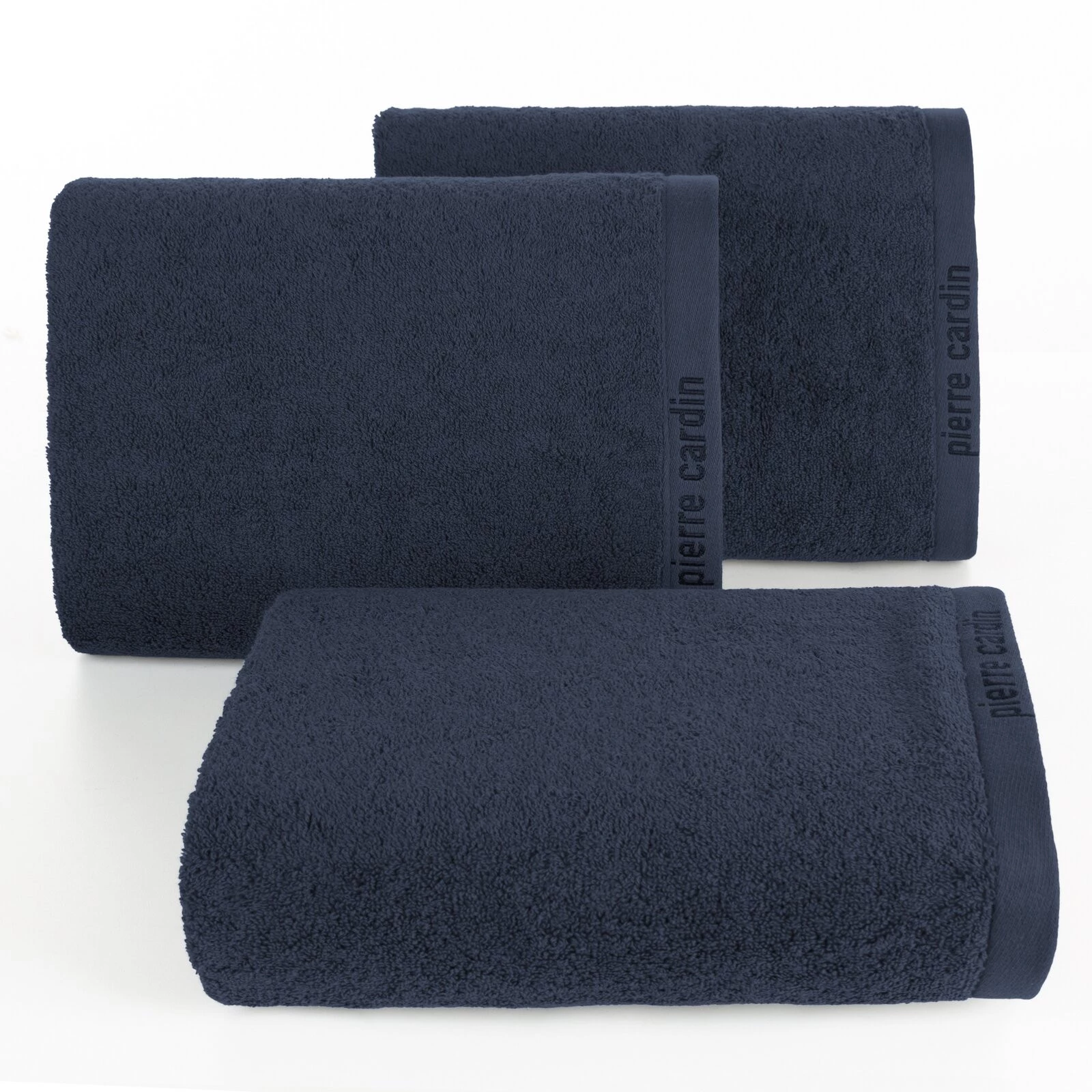 Jednokolorowy, klasyczny ręcznik kąpielowy z ekskluzywnej kolekcji Pierre Cardin zdobiony su btelną lamówką z logo projektanta. Wysokiej jakości tkanina. szerokość: 30 cm, długość: 50 cm, kolor: granatowy, Gramatura: 430 GSM, Skład: 100% bawełna