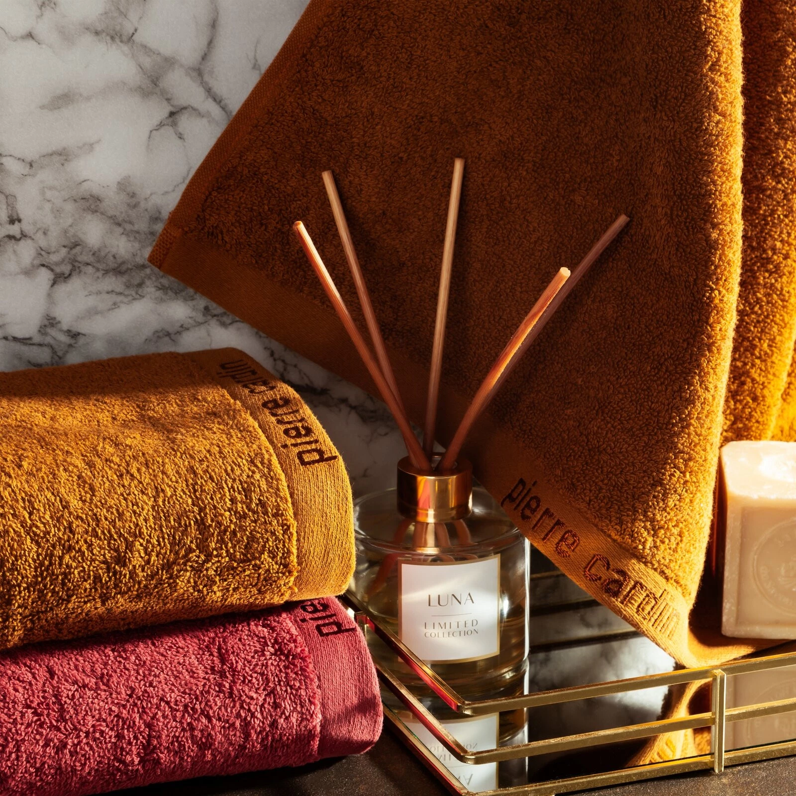 Jednokolorowy, klasyczny ręcznik kąpielowy z ekskluzywnej kolekcji Pierre Cardin zdobiony su btelną lamówką z logo projektanta. Wysokiej jakości tkanina. szerokość: 30 cm, długość: 50 cm, kolor: butelkowy zielony, Gramatura: 430 GSM, Skład: 100% bawełna