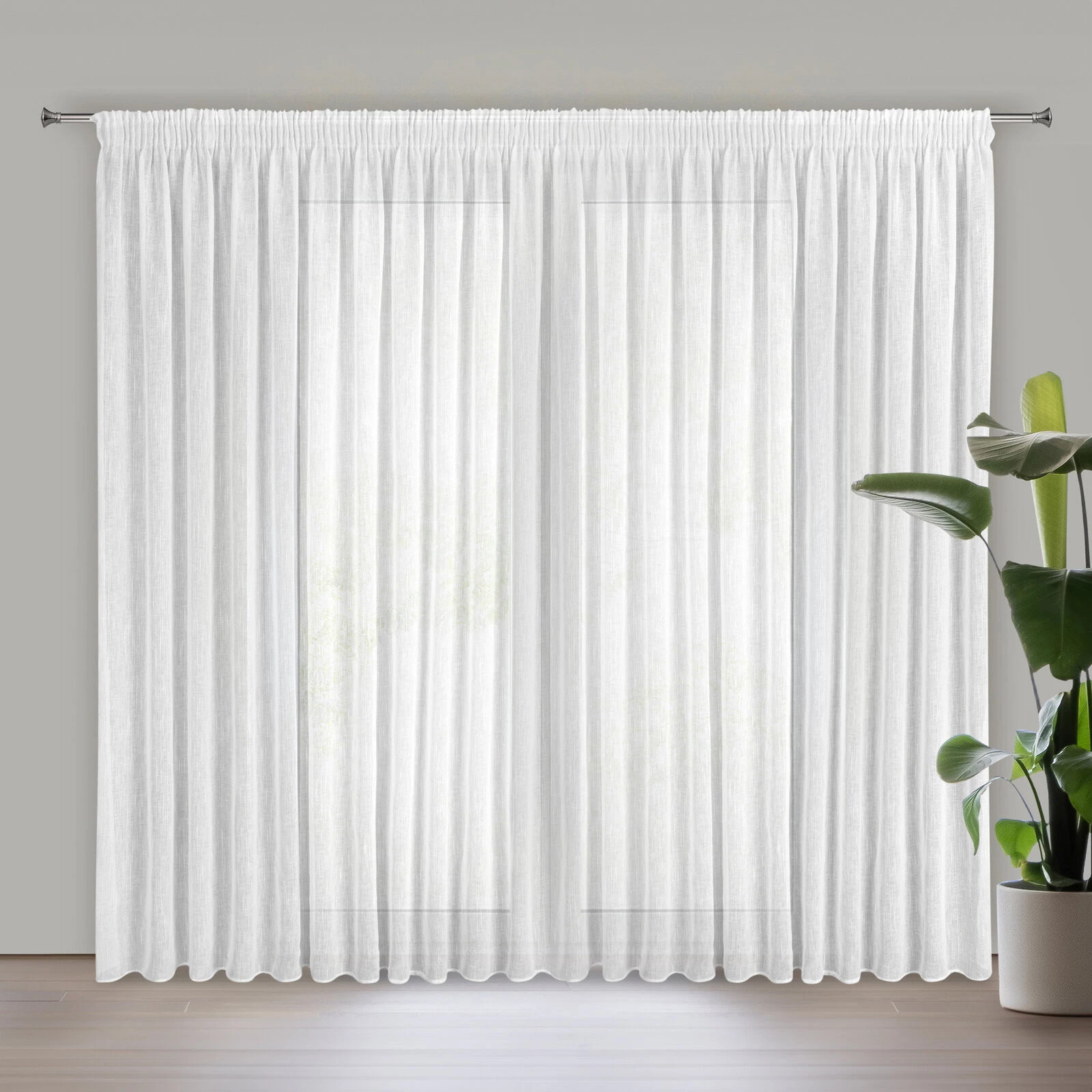 Firana gotowa o strukturze deszczyku szerokość: 300 cm, długość: 270 cm, kolor: biały, Gramatura: 130 GSM, Skład: 100% poliester
