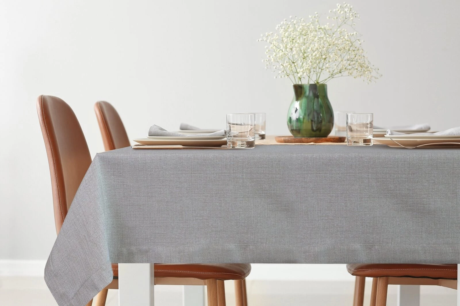 - Obrus zdobiony kantą i srebrną nicią szerokość: 145 cm, długość: 300 cm, kolor: srebrny, Gramatura: 280 GSM, Skład: 100% poliester