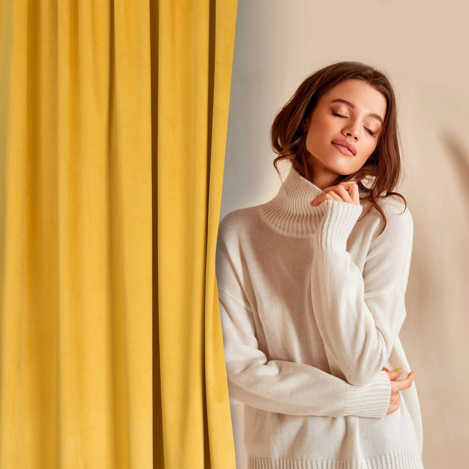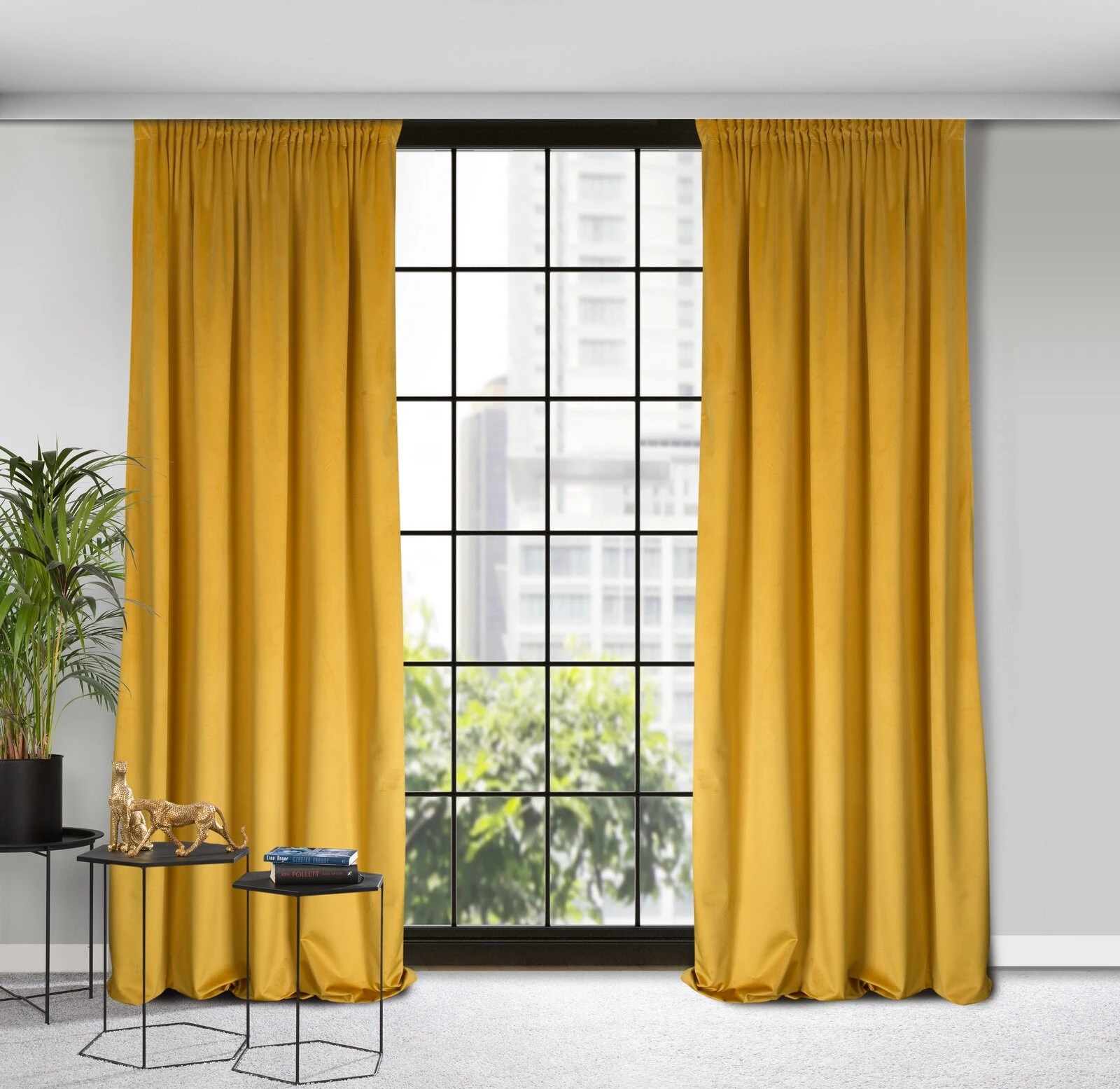 - Zasłona welwetowa jednokolorowa szerokość: 135 cm, długość: 300 cm, kolor: musztardowy, Gramatura: 200 GSM, Skład: 100% poliester