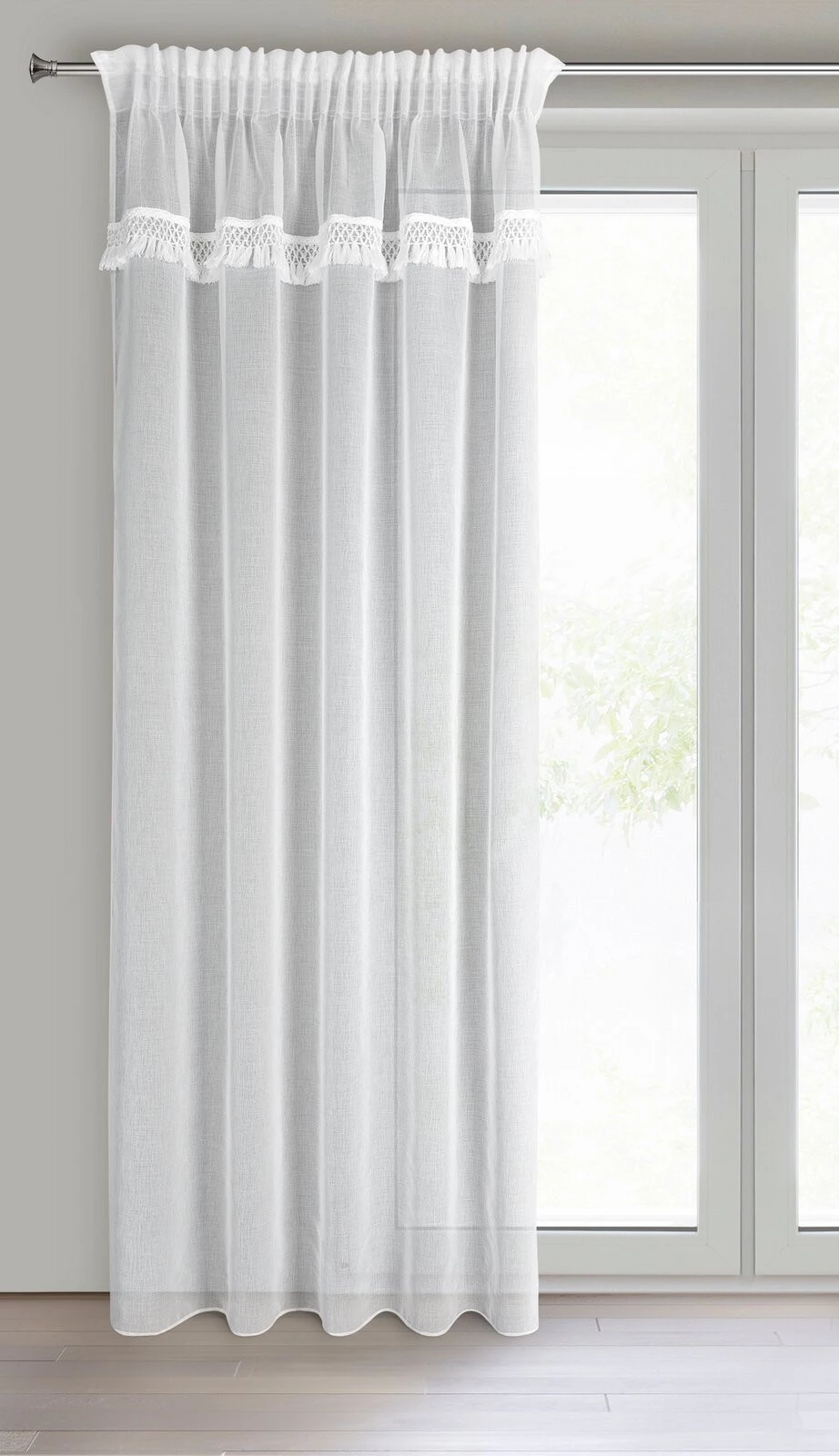 Firana gotowa z ozdobnymi frędzlami szerokość: 140 cm, długość: 270 cm, kolor: biały, Gramatura: 75 GSM, Skład: 100% poliester