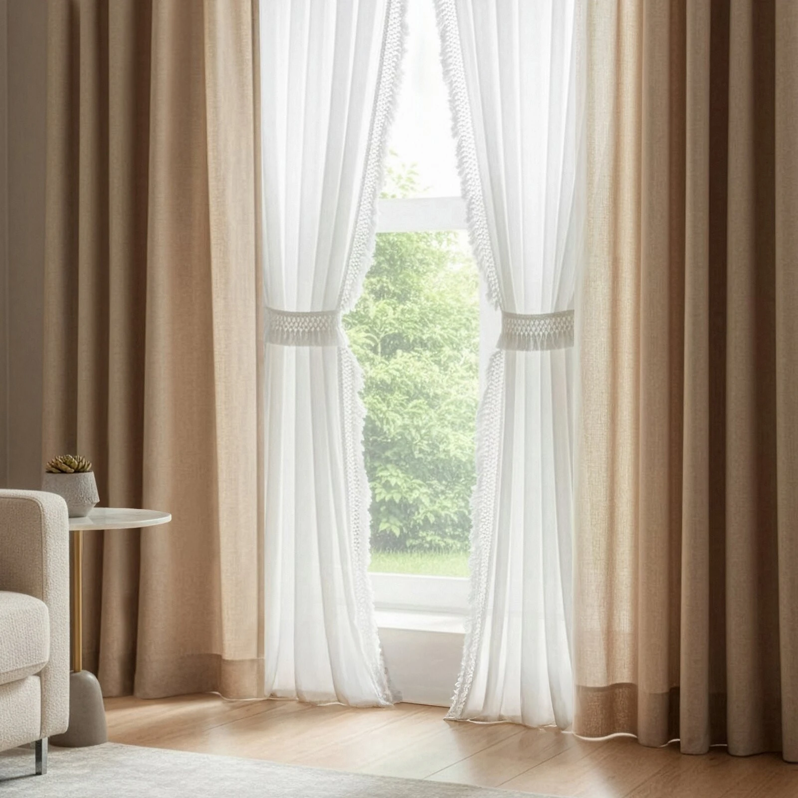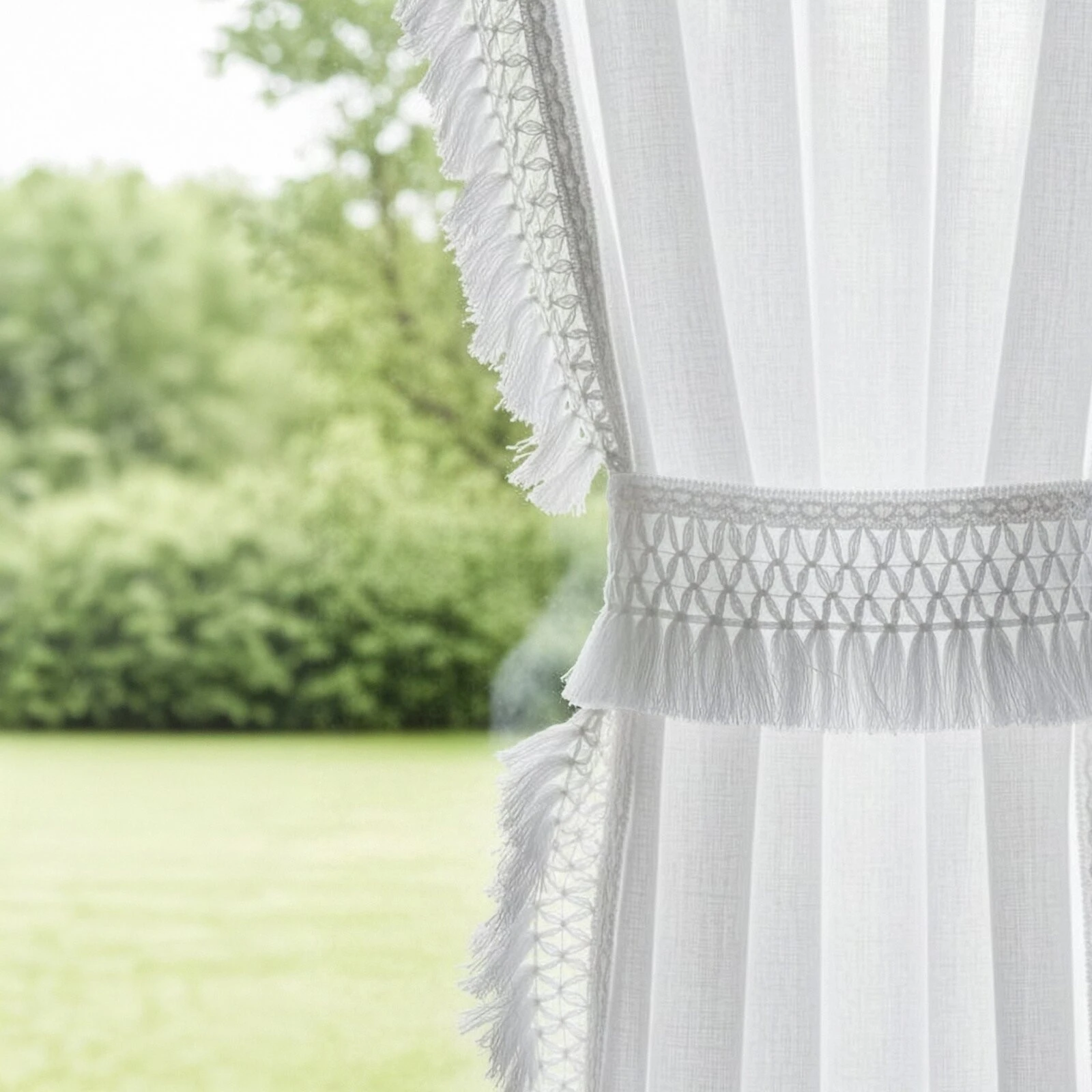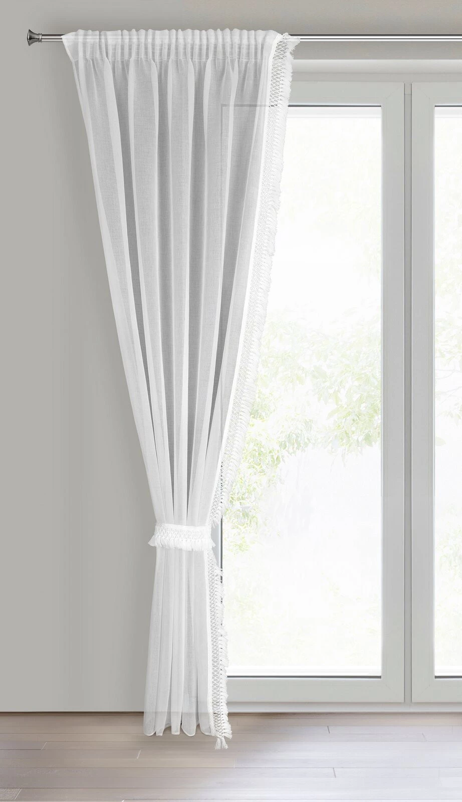 Komplet firan gotowych z ozdobnymi frędzlami po bokach i troczkiem szerokość: 140 cm, długość: 270 cm, kolor: biały, Gramatura: 75 GSM, Skład: 100% poliester