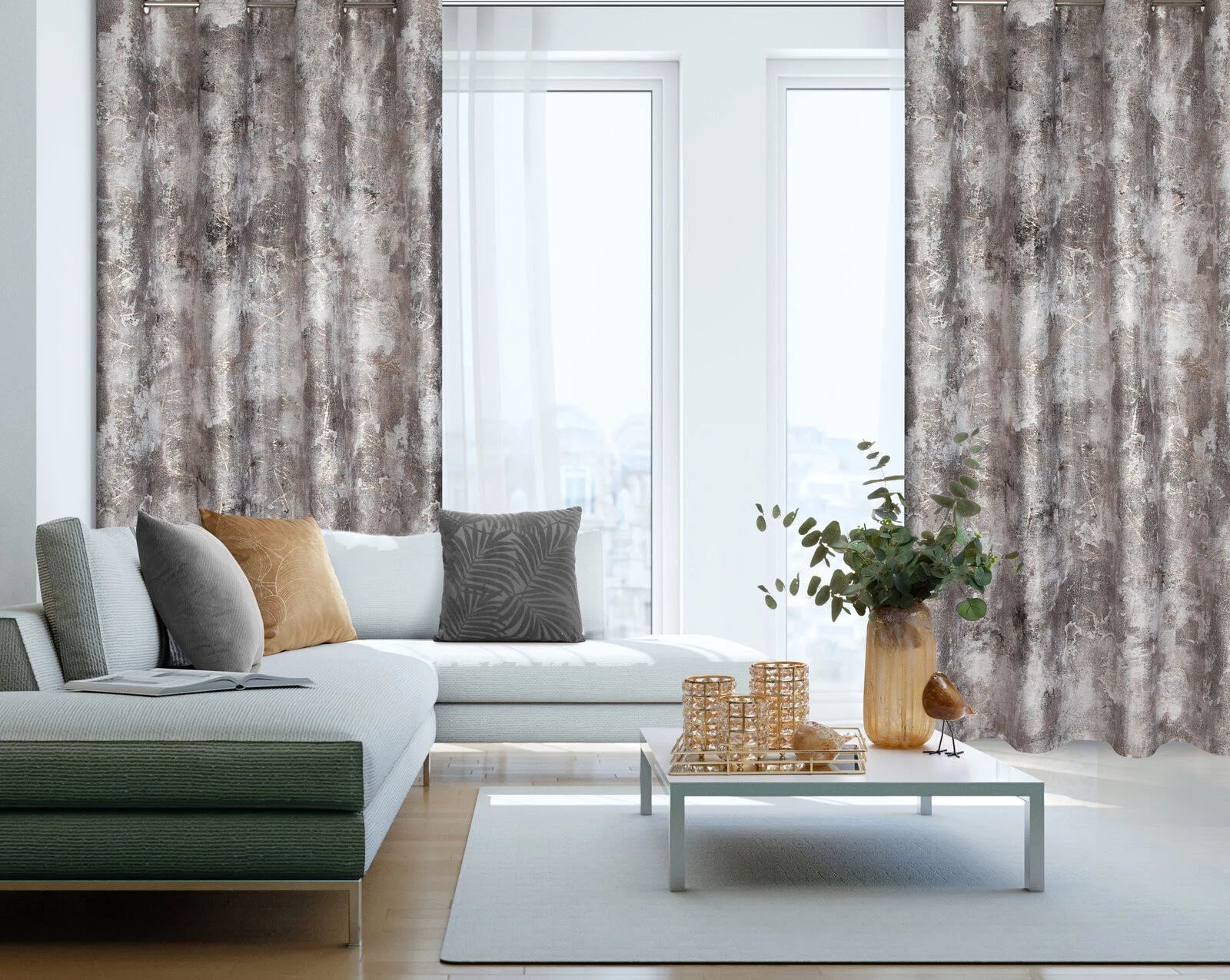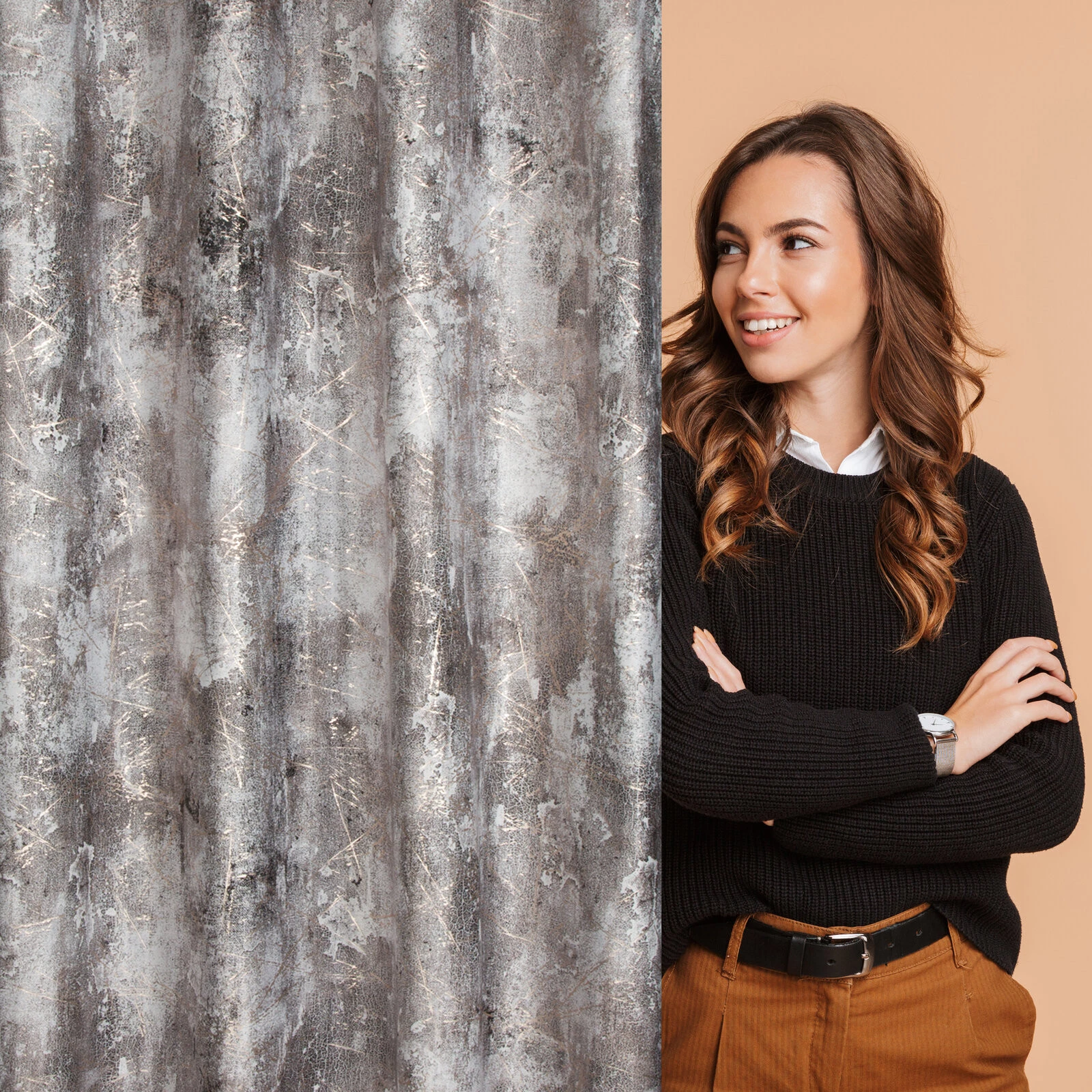 - Zasłona welwetowa z metalicznym nadrukiem szerokość: 140 cm, długość: 250 cm, kolor: stalowy, Gramatura: 200 GSM, Skład: 100% poliester