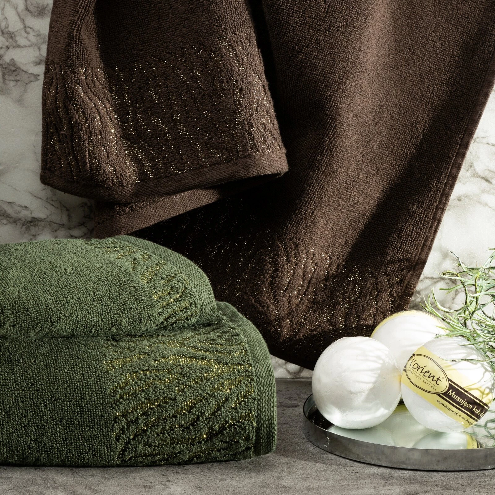 Ręcznik bawełniany z ozdobną bordiurą przetykaną błyszczącą nicią szerokość: 30 cm, długość: 50 cm, kolor: stalowy, Gramatura: 500 GSM, Skład: 100% bawełna; część ozdobna: 50% bawełna, 50% poliester